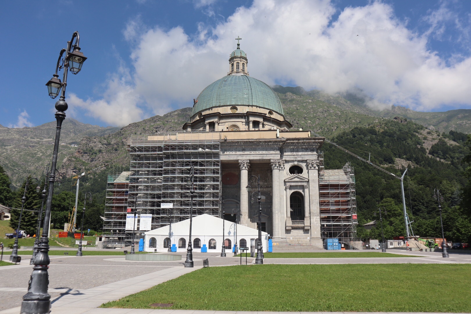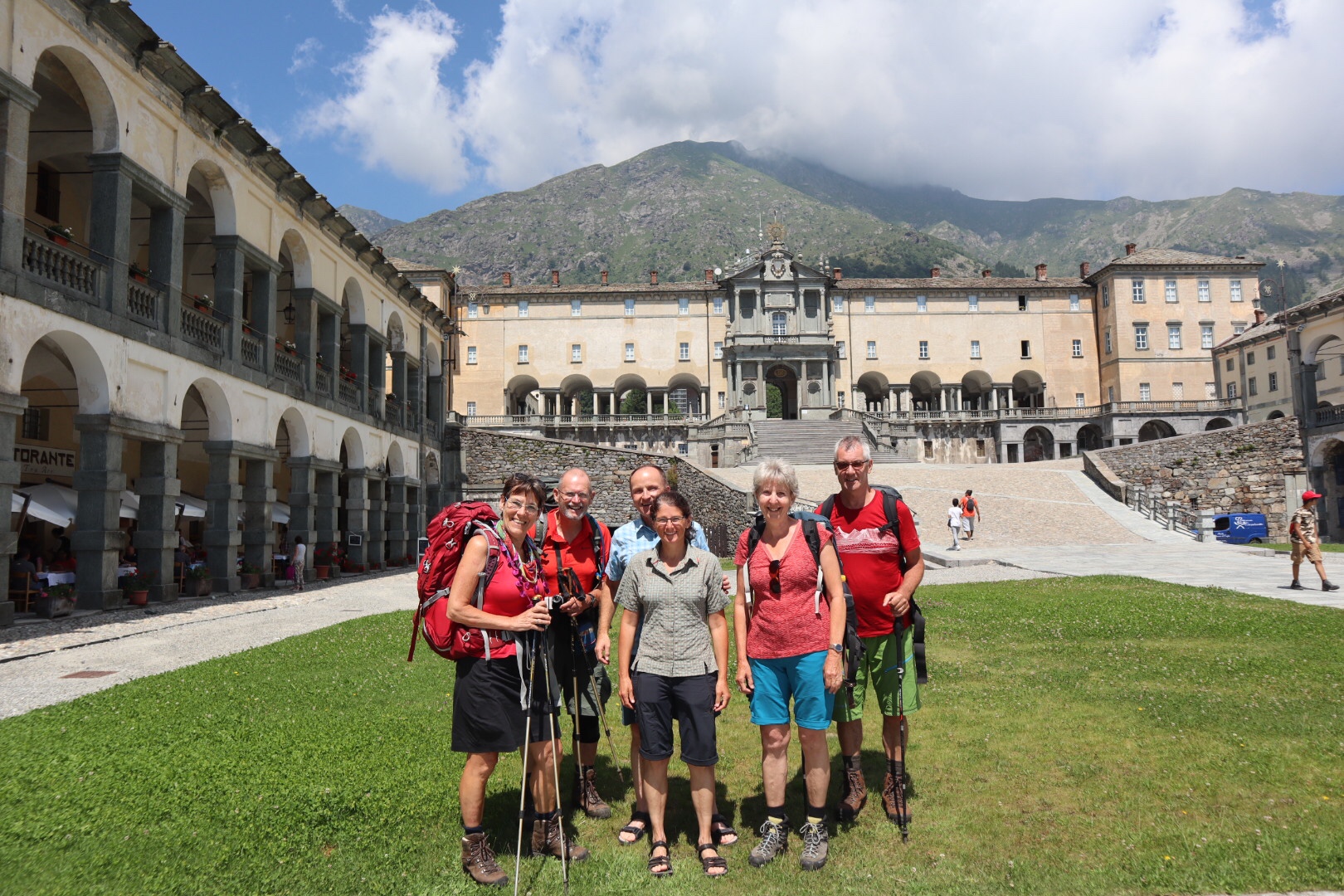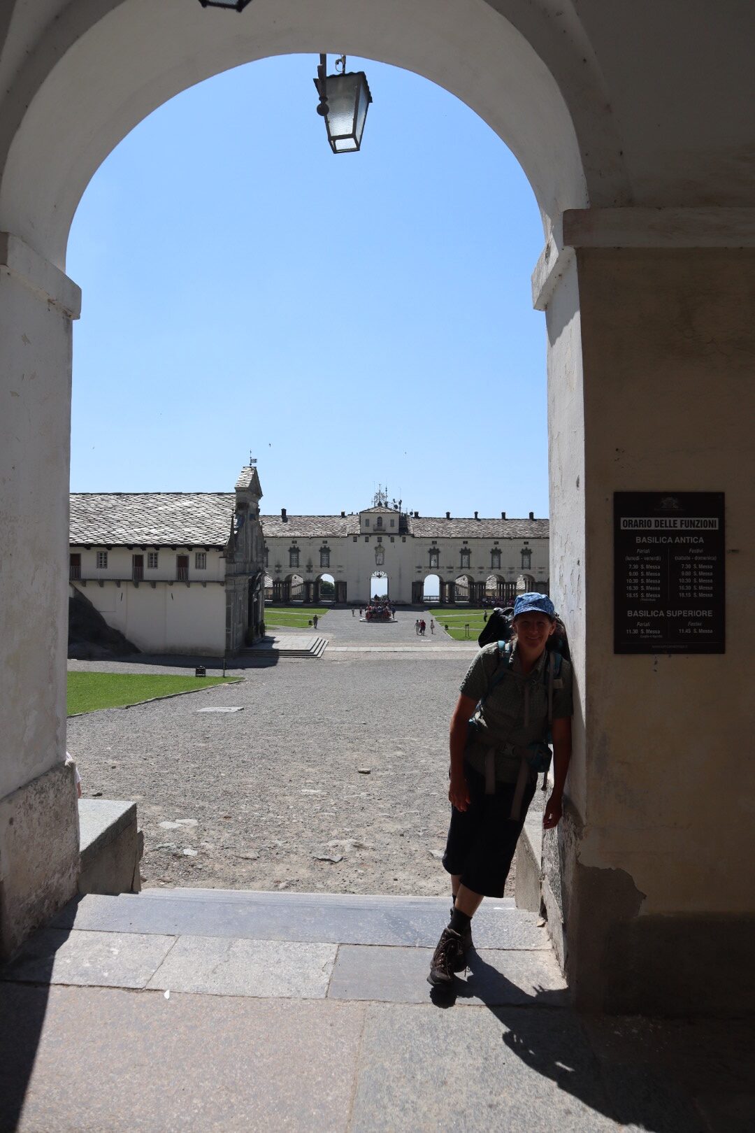 Heute ist nun unser Fast-Ruhetag. Die geplante Etappe ist mit 3 Stunden und 650 Höhenmetern kurz und wir werden somit ausreichend Zeit haben, um den riesigen Wallfahrtskomplex zu besichtigen. Bereits vor dem Mittag sehen wir auf dem Colle della Colma auf das riesige Santuario.