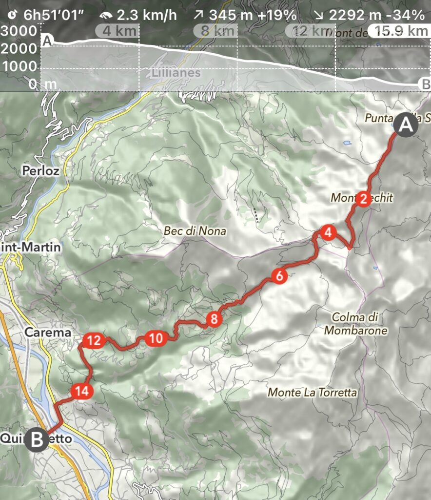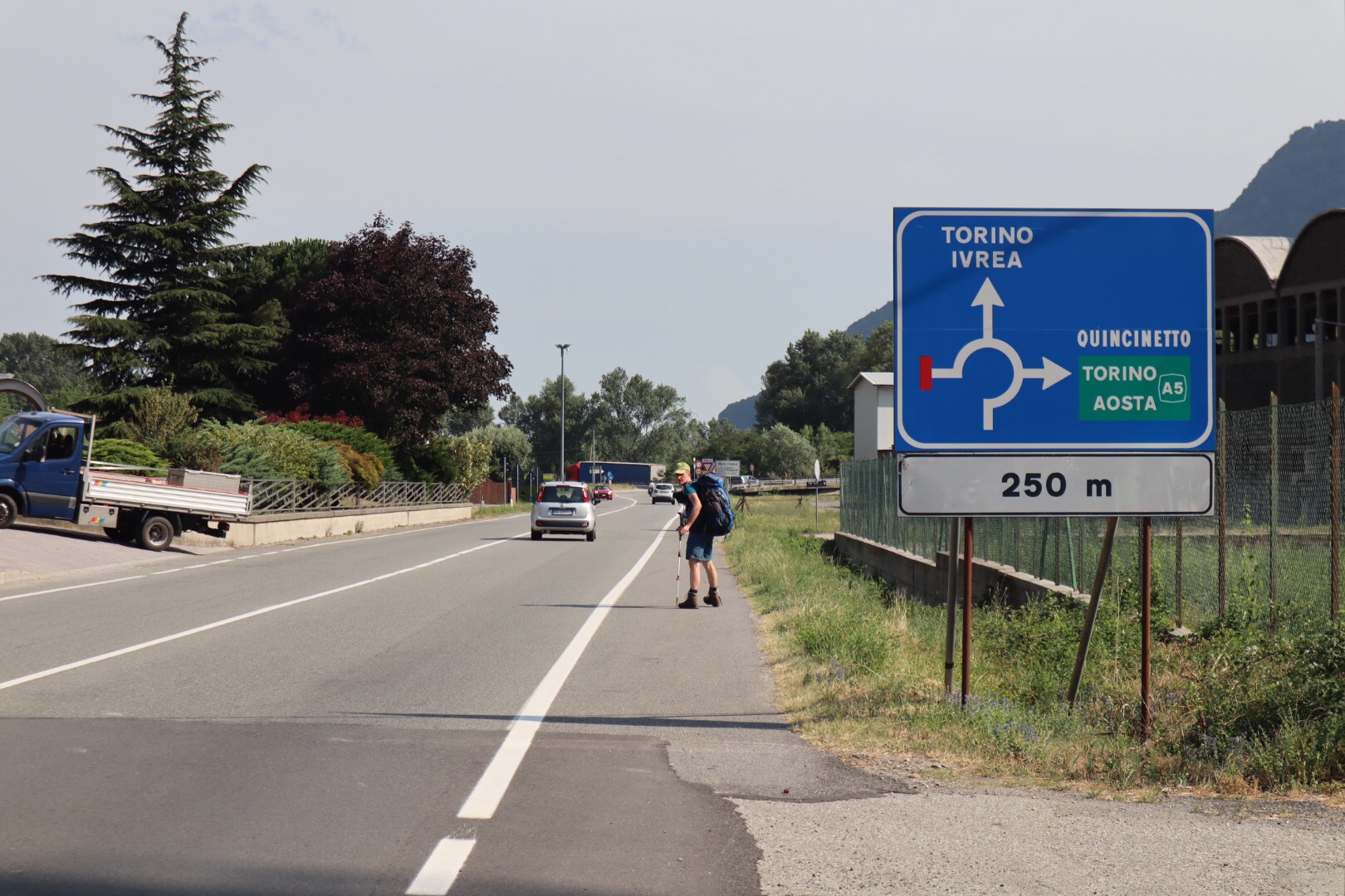 Nach unserer 3-1/2 stündigen Mittagspause steigen wir nochmals 1000 Hm ab, und dies mit vollen Bäuchen. Nach über 2000 HM Abstieg erreichen wir Quincinetto, welches mit 295 müM der tiefste Punkt an der offiziellen GTA ist. Eigentlich hört der GTA an der Piemonter Grenze auf, die meisten gehen dann aber bis nach Ventimiglia ans Meer weiter.