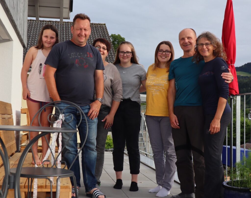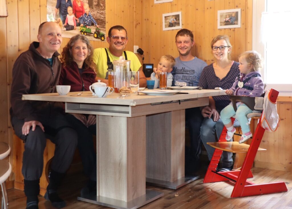 Sollen wir einfach bei der früheren Nachbarsfamilie und zugleich Schulfreund von Thomas vorbeifahren? Das geit würklech ned. Der Kaffeehalt bei Aerne‘s wird spontan verlängert, zwei zusätzliche Teller aufgetischt und ganz unkompliziert etwas mehr Zmittag gekocht. Einfach toll.