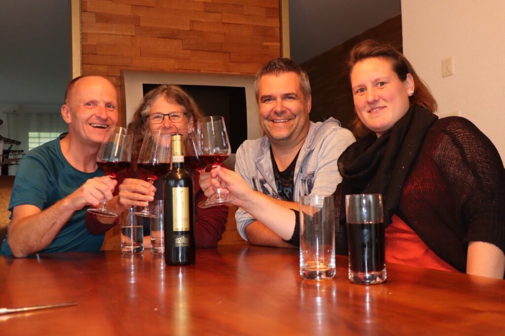 Am Abend sitzen wir am Familientisch von Martin und Tabea bei einem Plättli und Rotwein. Der Weinkeller von Martin lagert einige Perlen, welche auf gemeinsamen Weinreisen von Martin und Thomas probiert und geshoppt wurden und wir kommen natürlich in den Genuss. Auch heute Nacht wird uns ein Bett angeboten, so bleibt das Zelt einmal mehr trocken im Rucksack und wir schwelgen in Luxusgefühlen.
