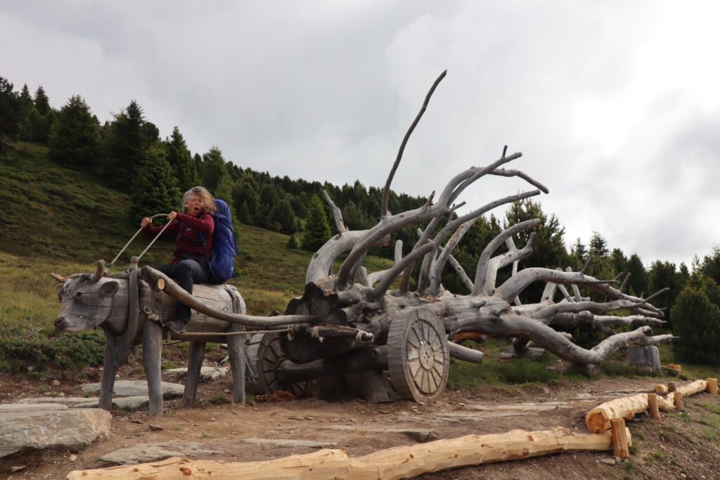 Zeitgleich mit dem ersten Besucher verräumen wir unser Zelt an diesem Sonntagmorgen bei der Kapelle Freienbühel. Wir sind richtig früh unterwegs, steigen hoch zur Bergstation Kreuztal und nehmen den Woody Walk. Toller Holzerlebnisweg für Kinder, so früh am Morgen können wir hemmungslos selber nochmals Kinder sein.