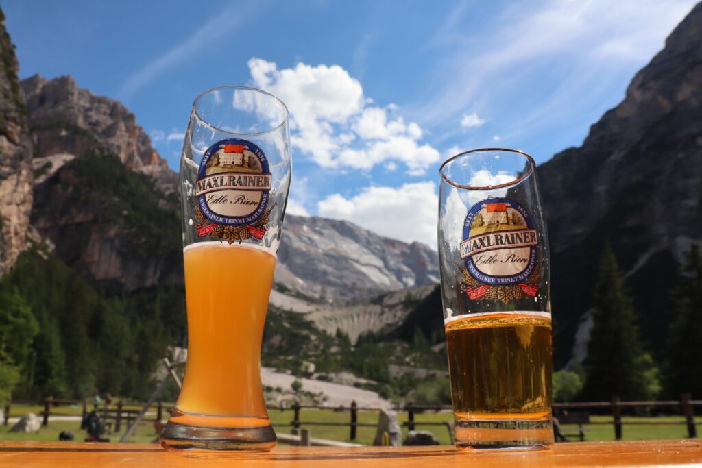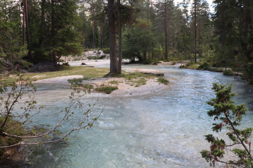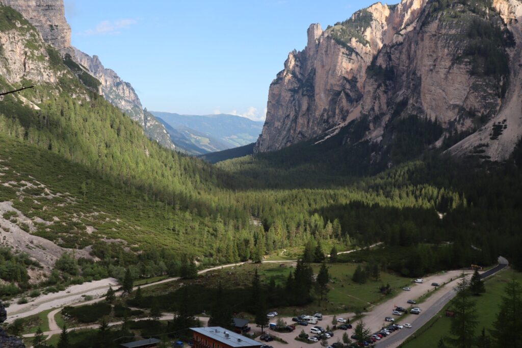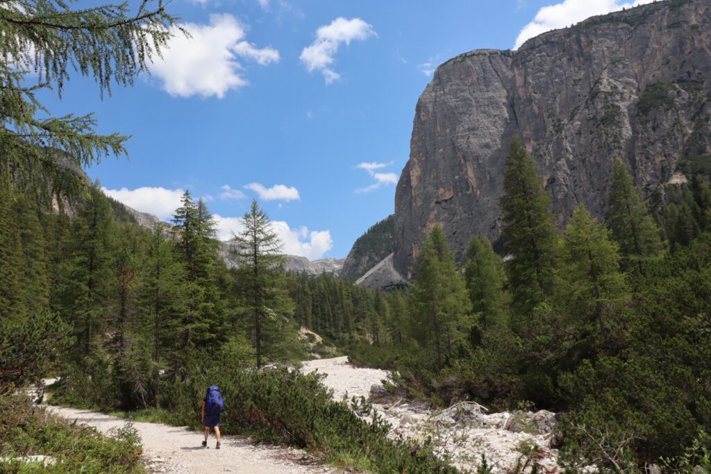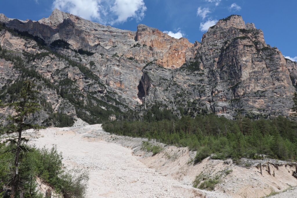 Im Winter ist San Vigilio Teil des bekannten Skigebietes Kronplatz. Entsprechend touristisch ist die Region. Wir ziehen direkt weiter Richtung Pederü. Fast endlos führt der Weg dem gut gefüllten Bach entlang, eingeklemmt zwischen eindrücklich gefärbten Felsformationen, bis diese sich in hufeisenform am Ende des Tals zu einem immensen Kessel vereinigen.