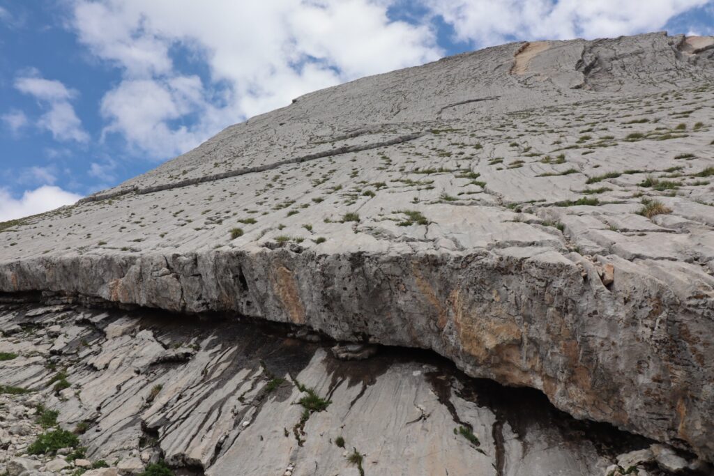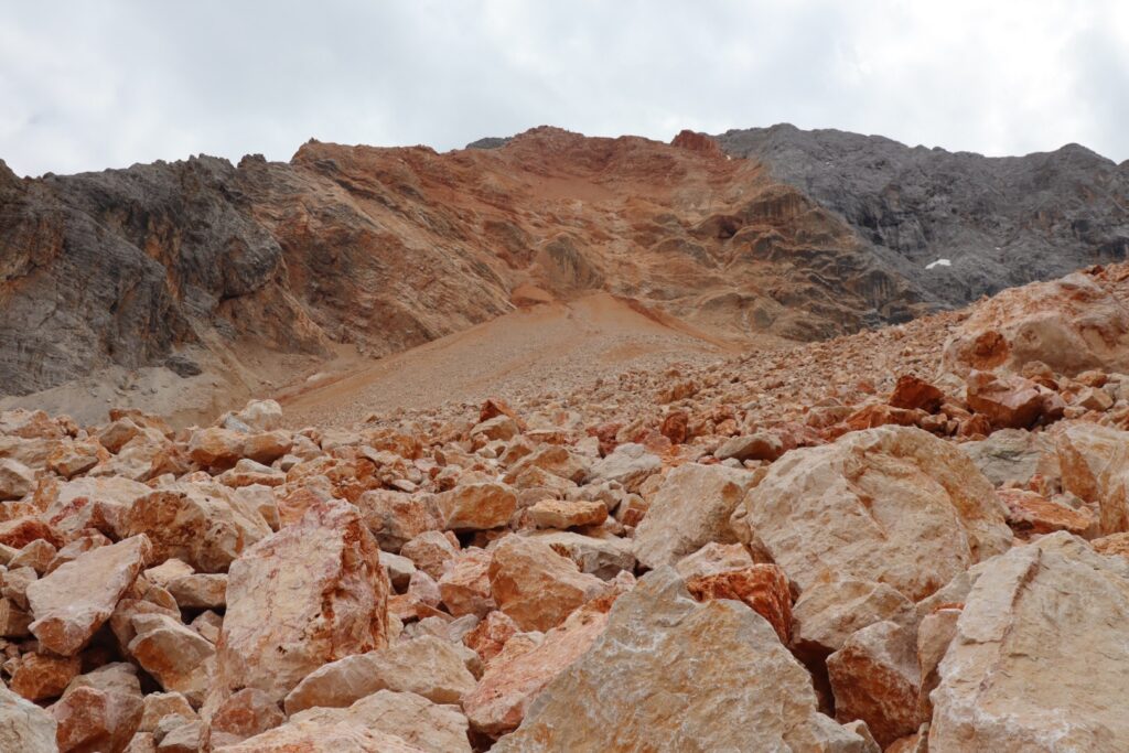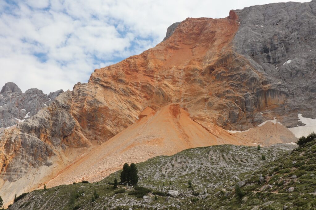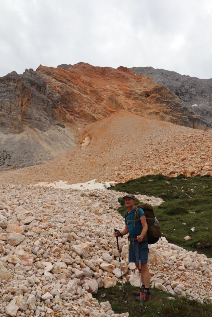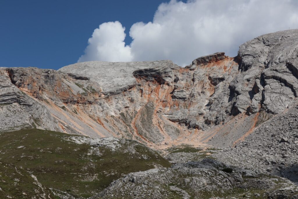 In der Zwischenzeit zeigt sich sogar die Sonne wieder zögerlich und das leuchtende Orange des Felssturzes von 2016 am Kleinen Gaisl ist noch eindrücklicher.