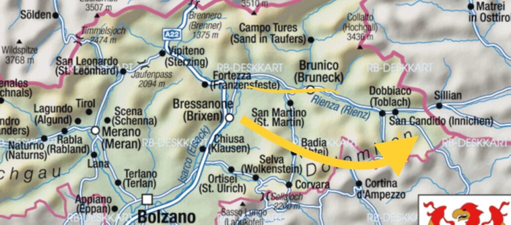 Bereits kurz nach dem Mittag überqueren wir das Würzjoch und befinden uns nun in der Region der ladinischen Sprache. Dolomitenladinisch bezeichnet man eine Gruppe romanischer Dialekte, die in mehreren Alpentälern Oberitaliens gesprochen werden (Wikipedia). Offizielle Schilder wie z.B. Ortsschilder sind nun in drei Sprachen angeschrieben (deutsch, italienisch, ladinisch).