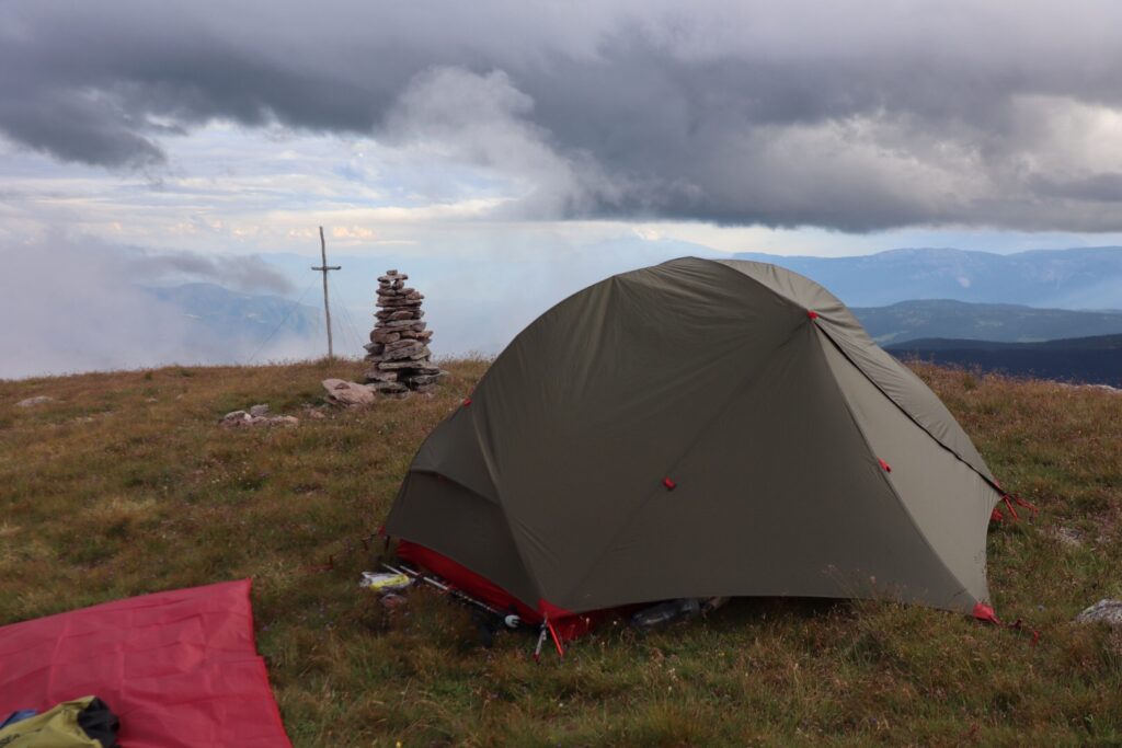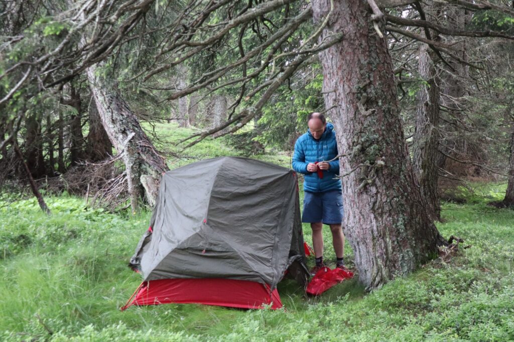 Da schon bald 18 Uhr ist, entscheiden wir, auf dem Hochplateau zu übernachten und hoffen auf tolle Aussicht beim Erwachen am nächsten Morgen. Ein Specht wird bestimmt nicht Tagwacht einklopfen können, denn wir sind deutlich über der Baumgrenze.