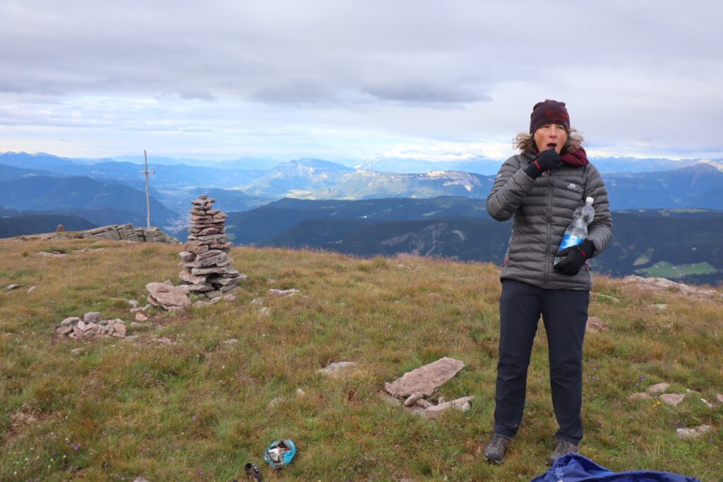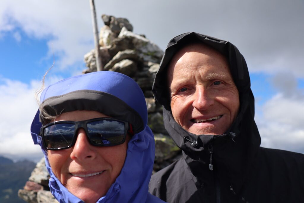 Beim letzten Gipfel für heute werfen wir uns doch noch in Regenmontur und auch der Wind bläst uns beinahe vom Weg.