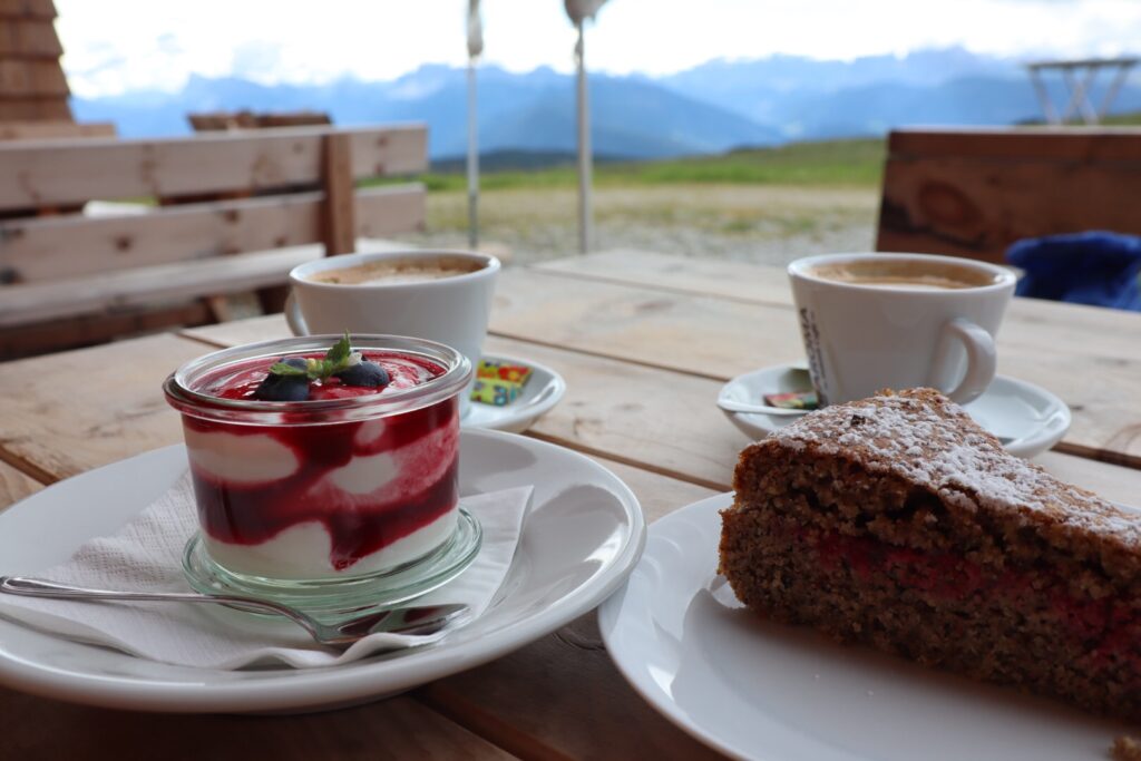 Bei der Auener Alm gönnen wir uns Cappuccino und Kuchen um unser Gemüt zu erhellen, denn der Himmel verdunkelt sich zunehmend und erste Regentropfen lassen nicht lange auf sich warten.