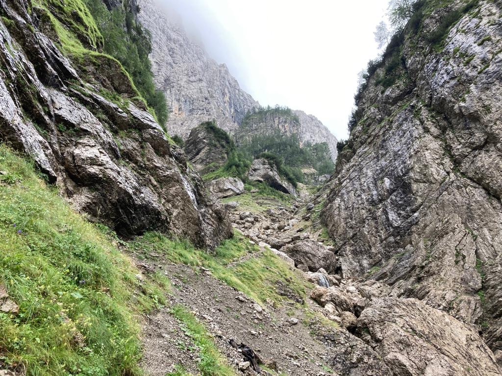 Kurz nach der Hütte steigen wir in ein Steincouloir ein, welches sich bei viel Regen zu einem Bach entwickelt.