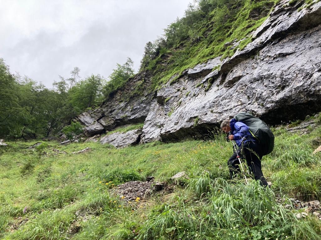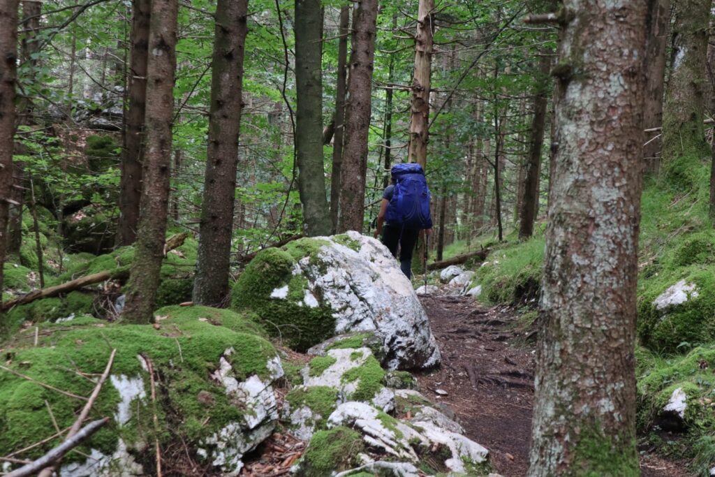 Mit durchnässten Füssen freuen wir uns auf den Mittagshalt im angeschriebenen Haus. Und tatsächlich lässt dann auch der Regen nach, beim langen Abstieg nach Trenta zeigen sich im düsteren Wald plötzlich feenhafte Goldschimmer von Sonnenstrahlen, das Märchen nimmt also doch ein Happyend!
