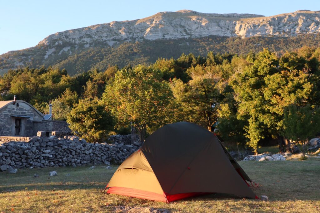 Der Wind nimmt laufend zu, sollen wir unsere angeschwächte Zeltstange gleich auf die Probe stellen? Aber zum Glück hat es nach etwa 2 Gehstunden nochmals eine Schutzhütte, die Veliko Libinje, und wir nehmen dieses Angebot doch gerne an.