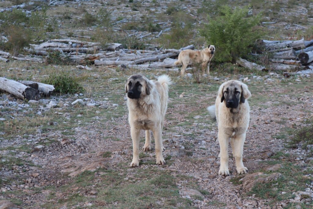 Der Tag ist synchron mit uns am Erwachen, doch bei uns gehts plötzlich rasant: drei Herdenhunde stehen auf unserem Weg und sind schon voll wach. Doch wir erkennen bald, dass sie eher neugierig als aggressiv sind und wo sie ihre Herde zum Beschützen haben, ist uns auch ein Fragezeichen.