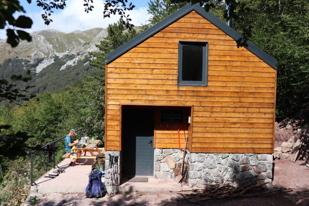 Da der geplante Gipfel Sveto brdo in den Wolken schmort, schenken wir uns diesen Umweg. So sind wir bereits am frühen Nachmittag am Etappenziel bei der wunderschönen, neu erbauten Schutzhütte Vlaški grad. Am liebsten würden wir bleiben. Aber Morgen sind noch 42 km bis zur Zivilisation, das heisst Restaurants, Bars, Betten, Einkaufsmöglichkeiten. Nach 7 Tagen fast ausschliesslich mit Rucksackfutter ist das schon ein Ansporn.