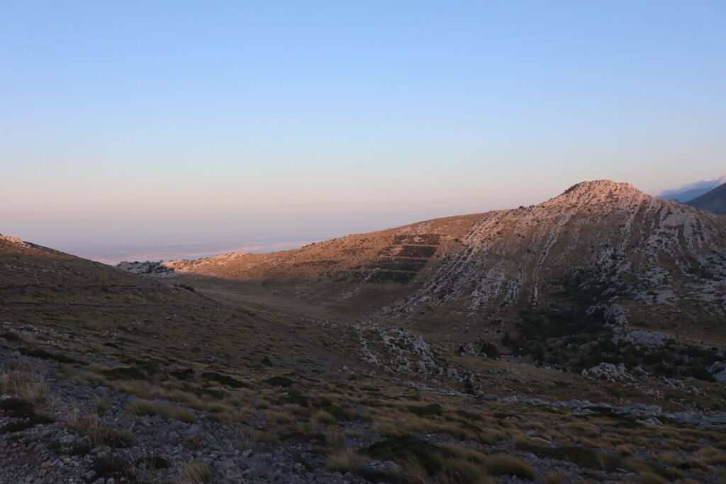 Erste Nebelfelder ziehen aus dem Landesinnern auf, unser Weg führt uns weit oben über diesen Gebirgszug und wechselt dabei immer wieder die Seite. So können wir den Kampf der Winde am eigenen Körper miterleben, denn die Krete ist die natürliche Barriere der Wolken aus dem Landesinneren.