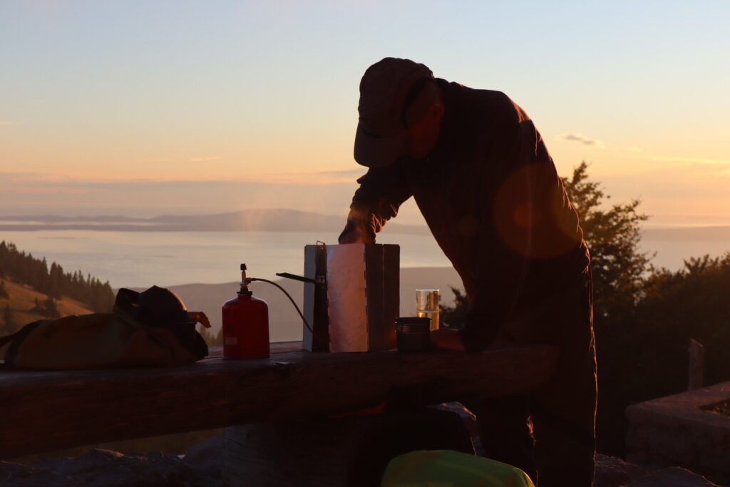 Die Zavizan Hütte setzt die Corona-Vorschriften sehr korrekt um und lässt Übernachtungsgäste nur auf Anmeldung zu. Wir bleiben aber hartnäckig und dürfen dann im Aufenthaltsraum unser Nachtlager einrichten, denn Campen wäre ja auch verboten. Essen verkaufen sie auch keines, wir dürften jedoch die Küche benutzen. Wir wählen dann die Terrasse bei Sonnenuntergang als Kochplatz und geniessen die schöne Abendstimmung.