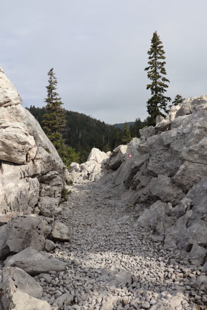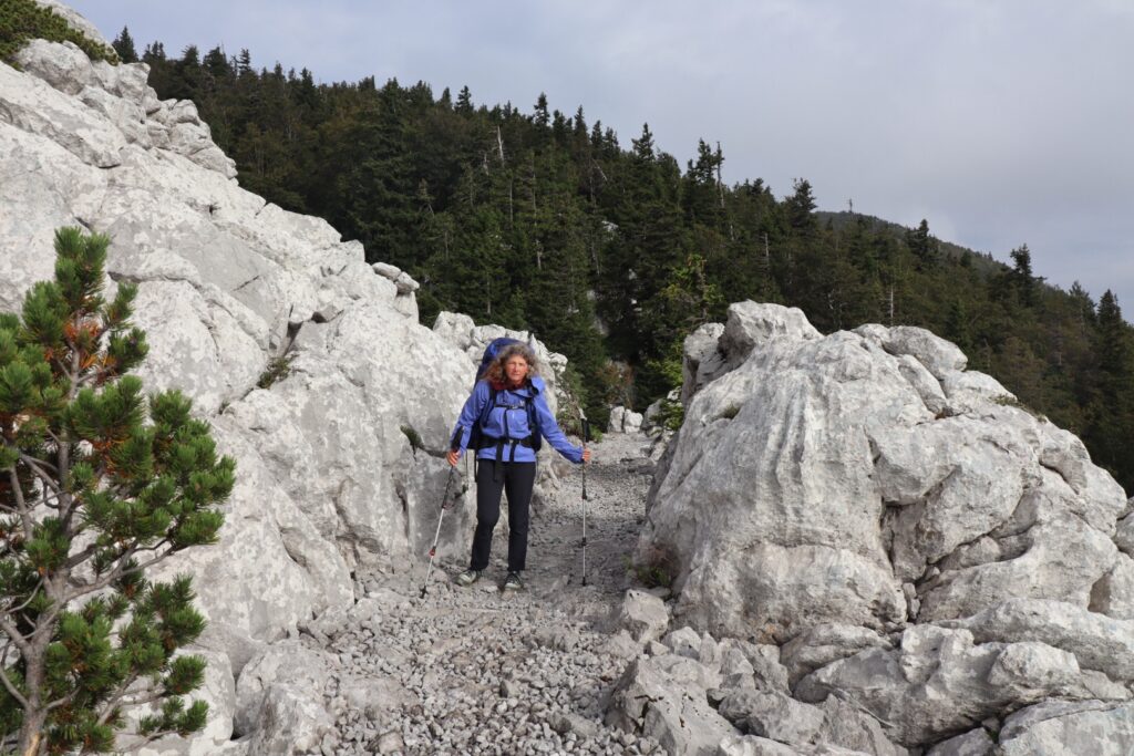 Bald schon erreichen wir den Startpunkt des 57 km langen Bergweges Premuzičeva Staza durch den Velebit Nationalpark mit seinen eindrücklichen Karstformationen. Dieser sehr aufwendige Weg wurde 1930-1933 erbaut und ‚verlaufen’ ist hier kaum mehr möglich. Ein ganz neues Gefühl, fast ohne Navigation und ohne Zusatzschlaufen durch den Tag zu gehen! Und wir treffen auf andere Menschen mit demselben Hobby.