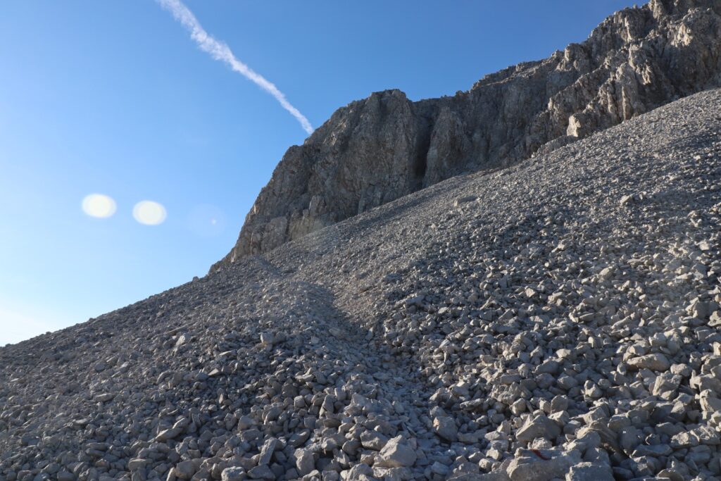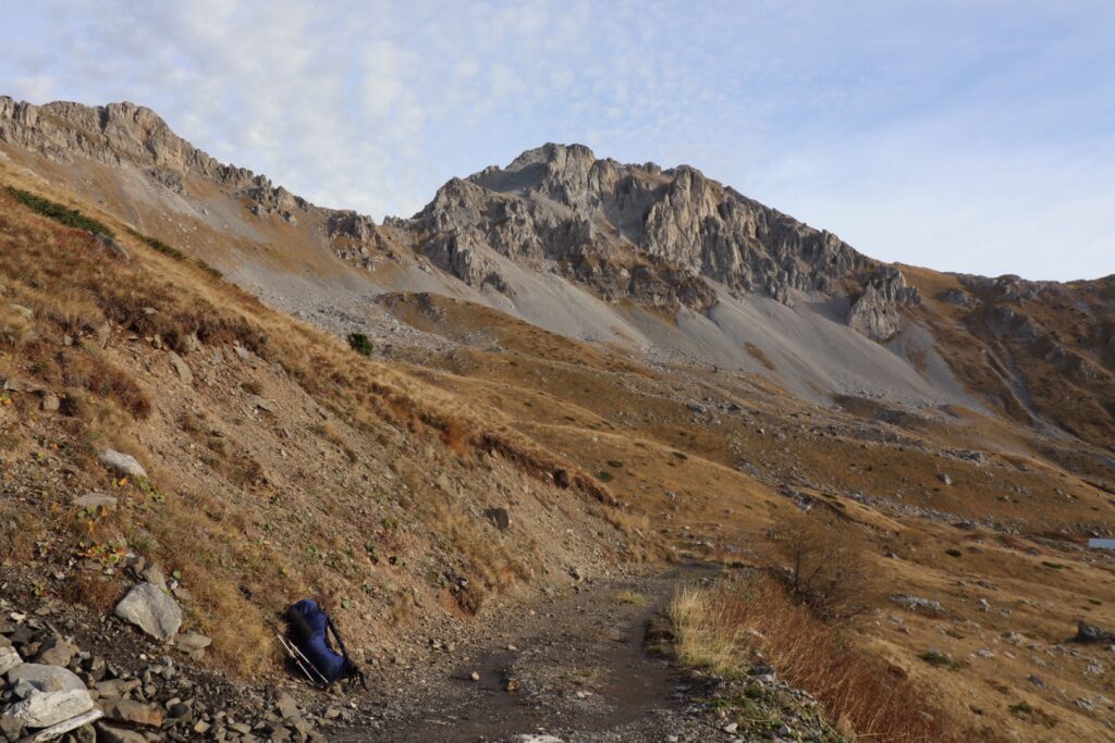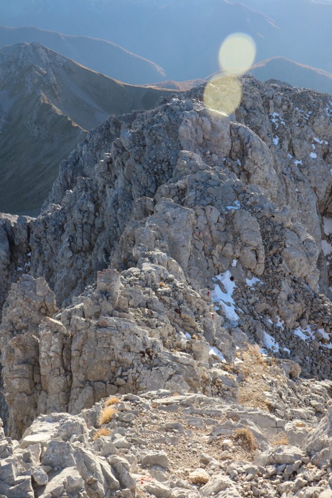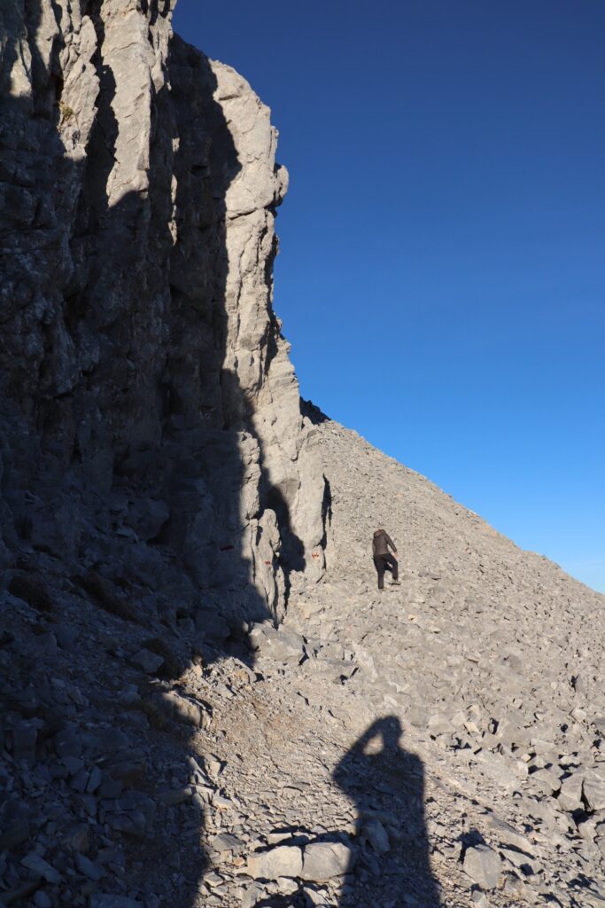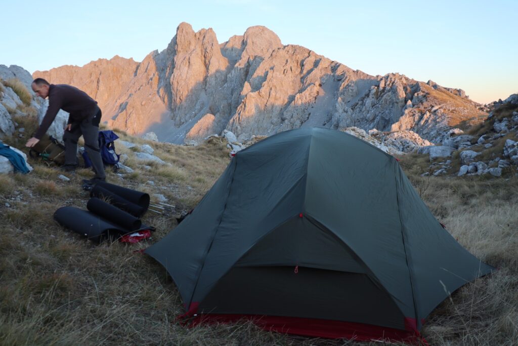 Auf dem Passübergang bei ca. 2150 MüM finden wir einen gut geschützten Zeltplatz. Es ist bereits 15:45 und es bleiben noch zwei Stunden für die Gipfelbesteigung und zurück. Das Gepäck lassen wir beim späteren Zeltplatz, es fühlt sich fast wie Fliegen an ohne das Zusatzgewicht auf dem Rücken. In 45 Minuten kraxeln wir den Gipfel hoch und lassen die Ruhe, die Weite und die Felsformationen um uns herum auf uns wirken.