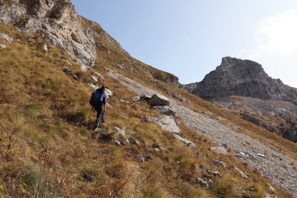 Die Wegspur ist nicht sehr ausgeprägt, so kraxeln wir nach Gutdünken den steilen Wiesenhang empor, darin haben wir ja mittlerweile Übung!