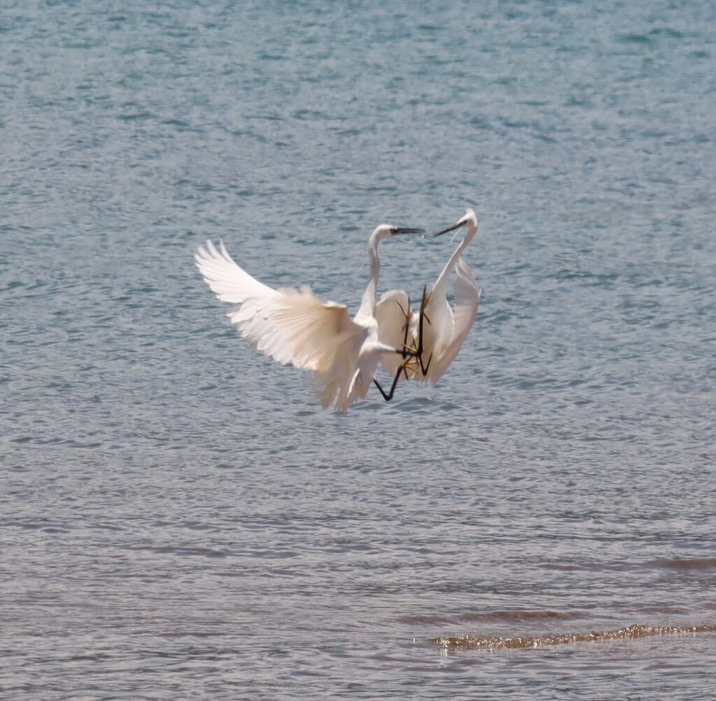 Zwei Seidenreiher, jawoll, gelbe Füsse und schwarzer Schnabel.
