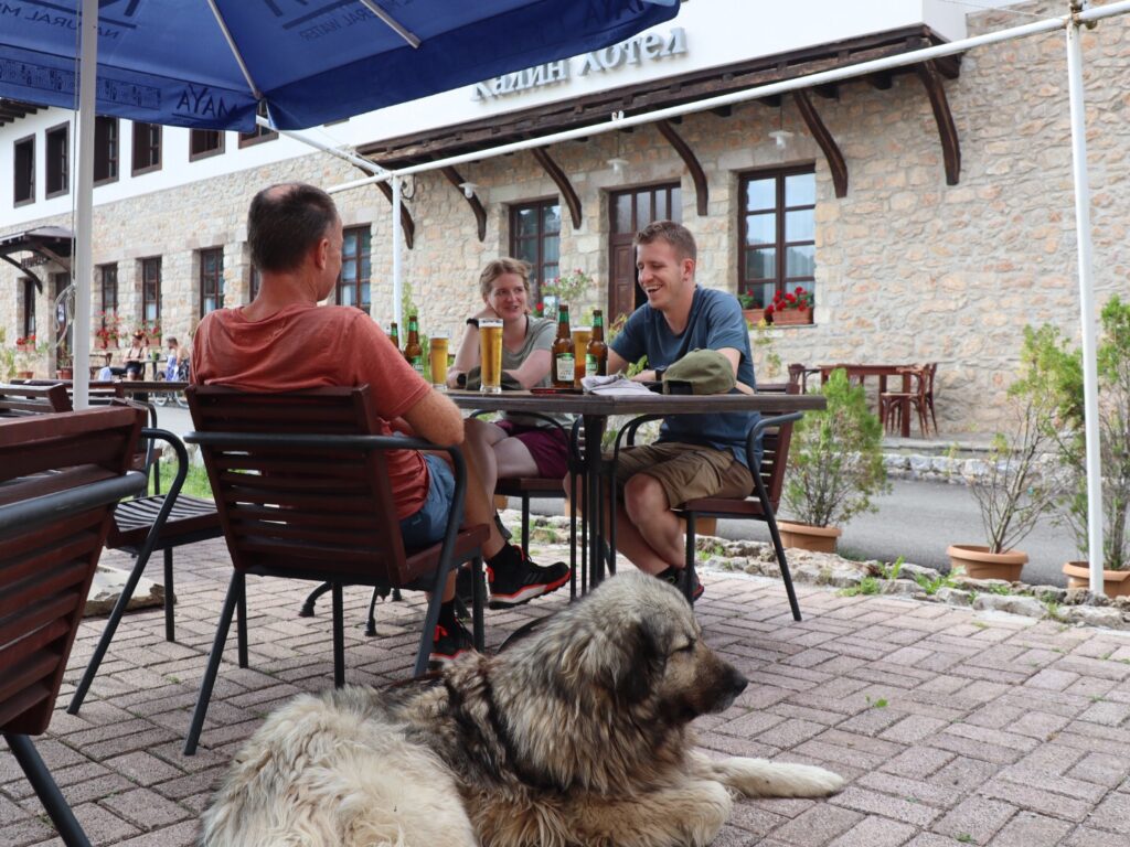 Ab jetzt sind wir für einige Tage im Mavrovo-Nationalpark unterwegs und tatsächlich folgt ein toller Wanderabschnitt durch den Wald welcher uns den Aufstieg in der Mittagshitze erleichtert. Da die Zimmer im Hotel Kalin in Lazaropole noch nicht bereit sind, kühlen wir uns zusätzlich mit Getränken auf der Terrasse.