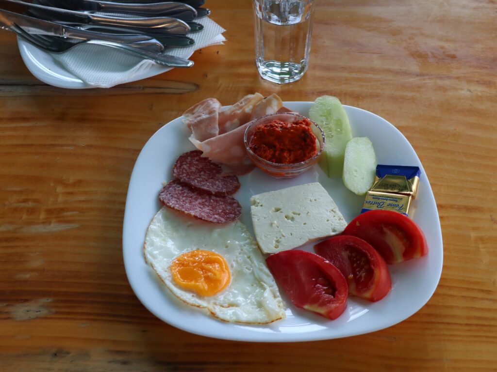 Das Geduldskamel ist heute beim Frühstück wieder einmal gefragt: Wir erhalten zwar um 8 Uhr den Cappuccino aber mehr passiert nicht. Der Dorfbäcker fährt vor und liefert Frischgebackenes mit Ofenhandschuhen. Es dauert dann allerdings nochmals eine halbe Stunde bis der noch warme Burek in vier Teile geschnitten auf unserem Tisch landet.