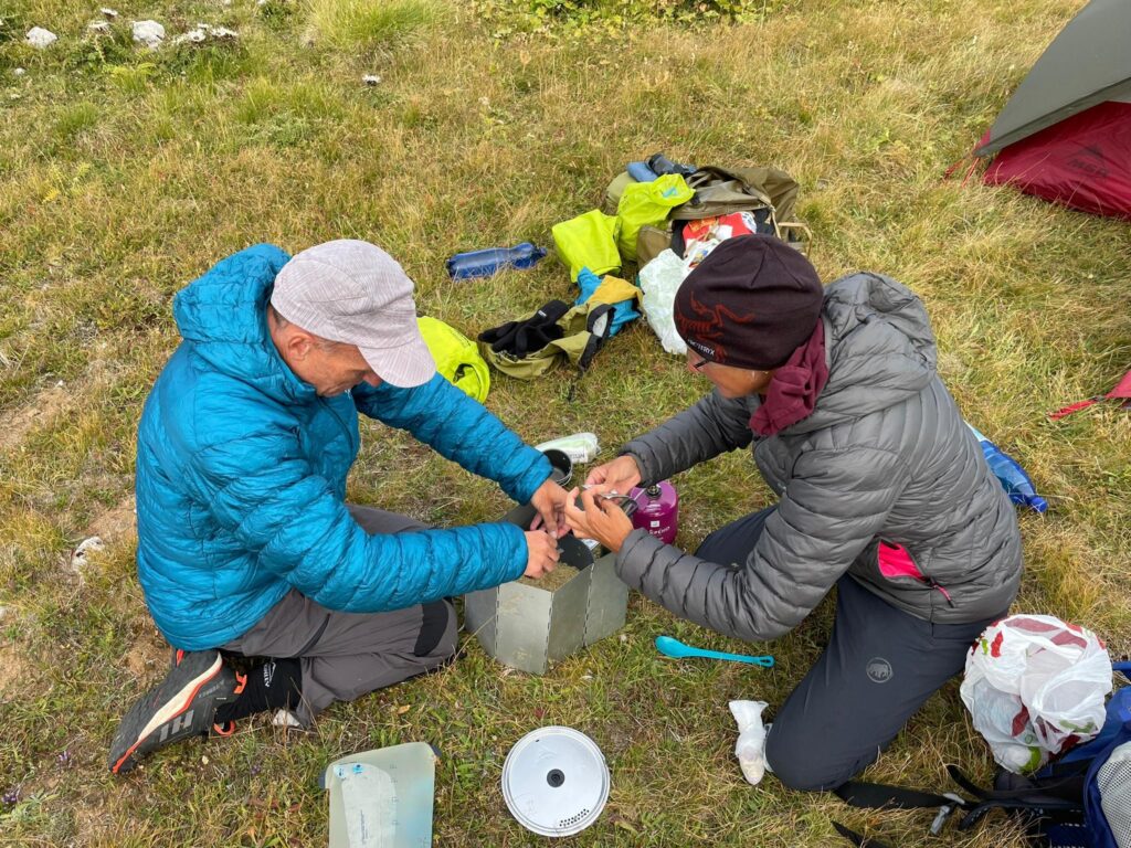 Aber zuerst geniessen wir nur wenig unterhalb des Gipfels nochmals das volle Outdoor-Programm mit Kochen, Campen, schönen Abendstimmungen und vielen Snacks zum Dessert. Schaffen wir es endlich einmal, mit einem ganz leeren Futtersack ins Tal zu kommen?