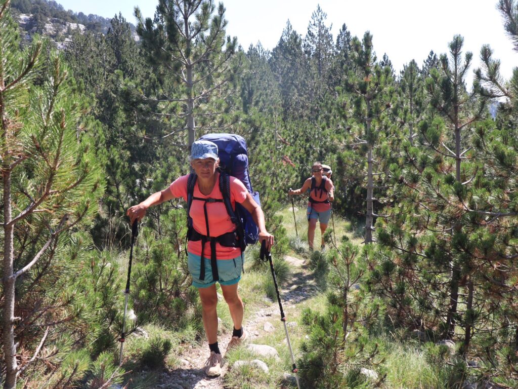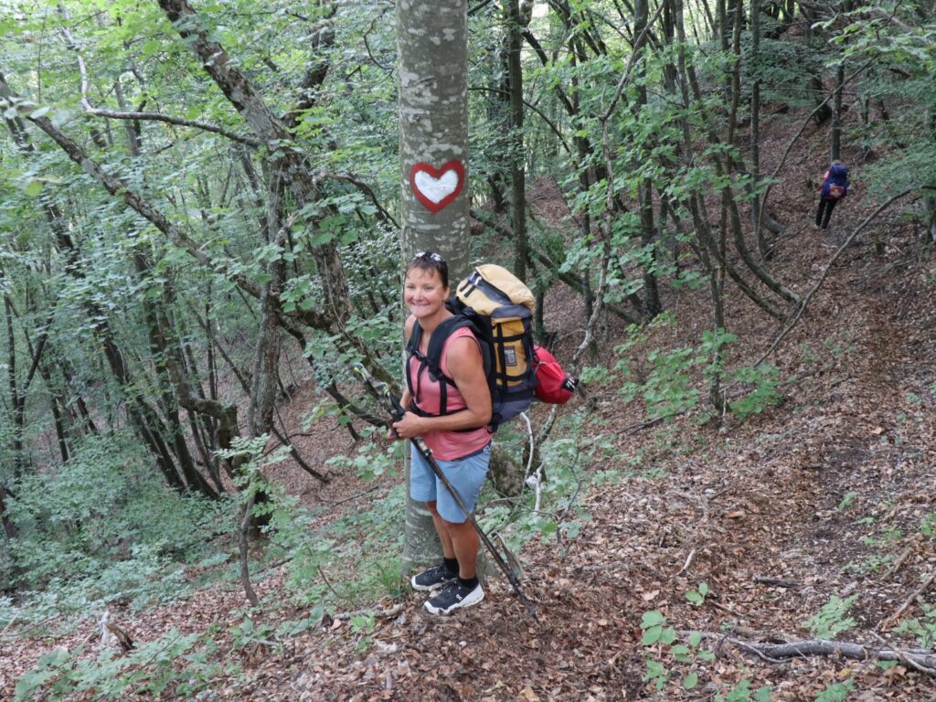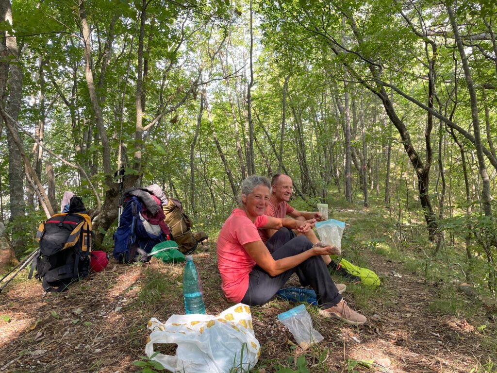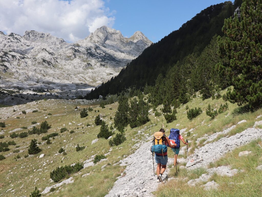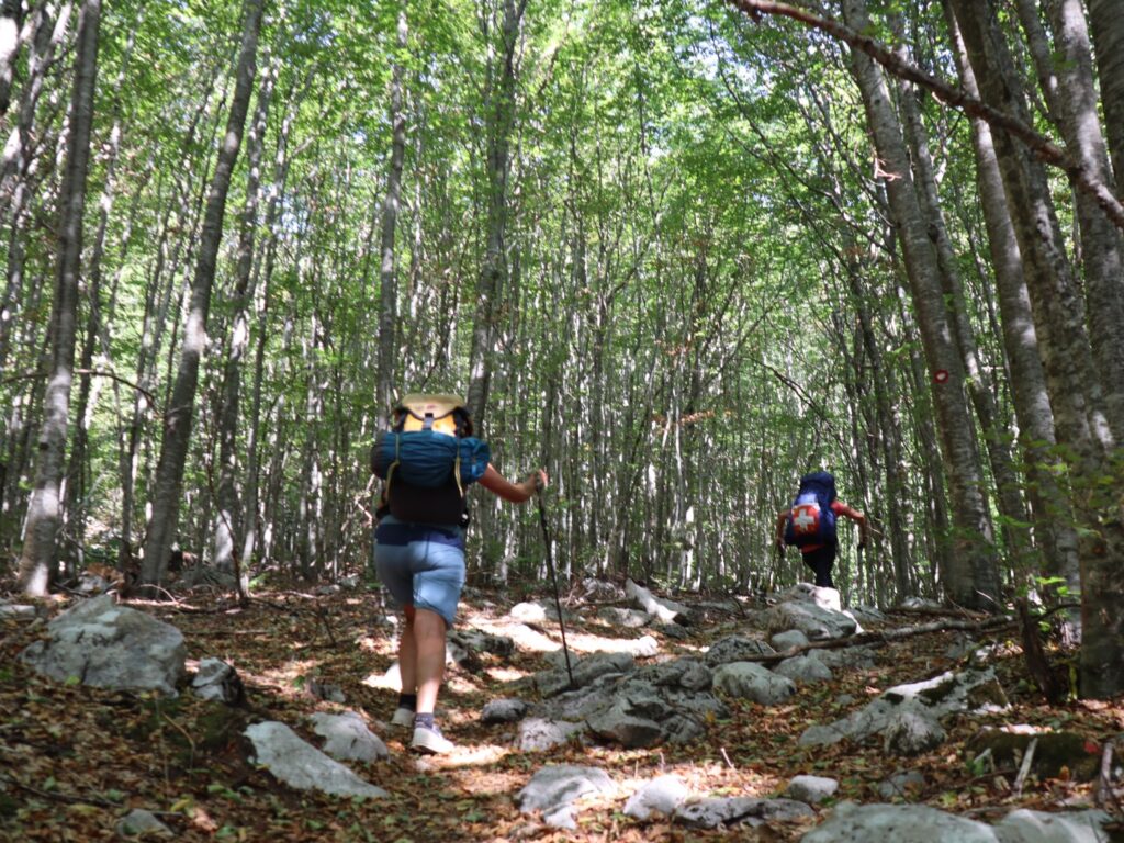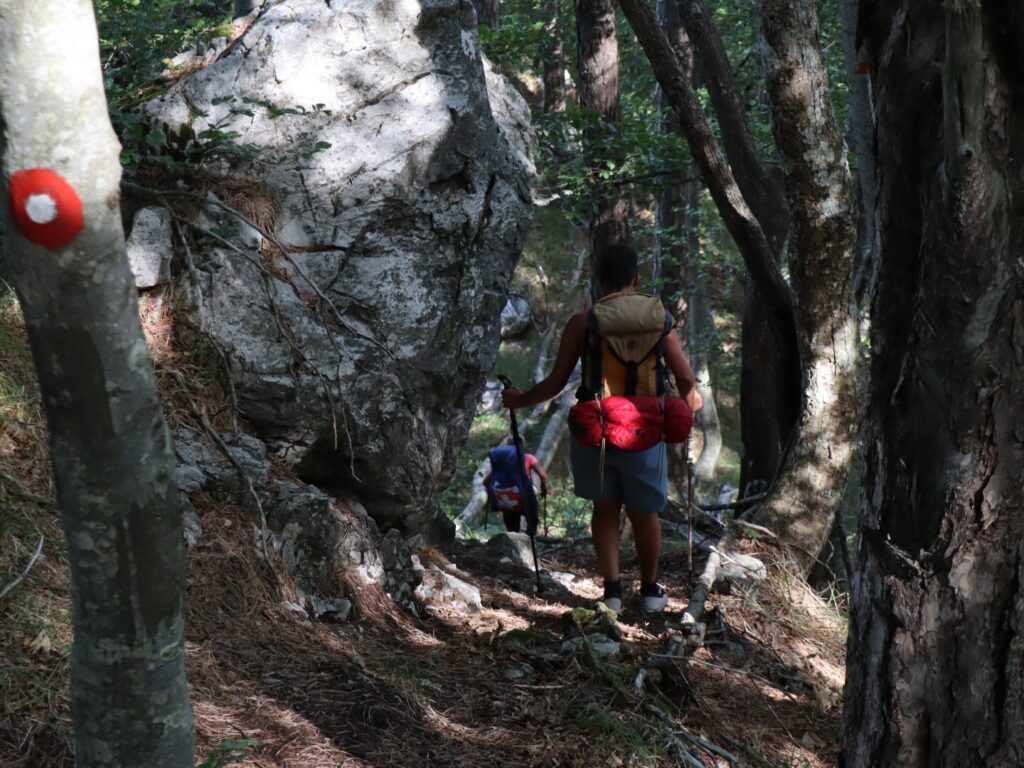 Der steile Abstieg nach Ravna durch einen für den Balkan so typischen Mischwald ist wunderschön. Zuerst quert der Weg im Hang und dann führt er mehrheitlich auf dem bewaldeten Grat über 1500 HM immer tiefer. Bei Regen oder Nässe ein heikler Abschnitt, denn Ausrutschen ist an einigen Stellen nicht empfohlen. Obwohl der Wanderweg gut markiert ist, bleibt er wild und ursprünglich, so richtig nach unserem Geschmack.