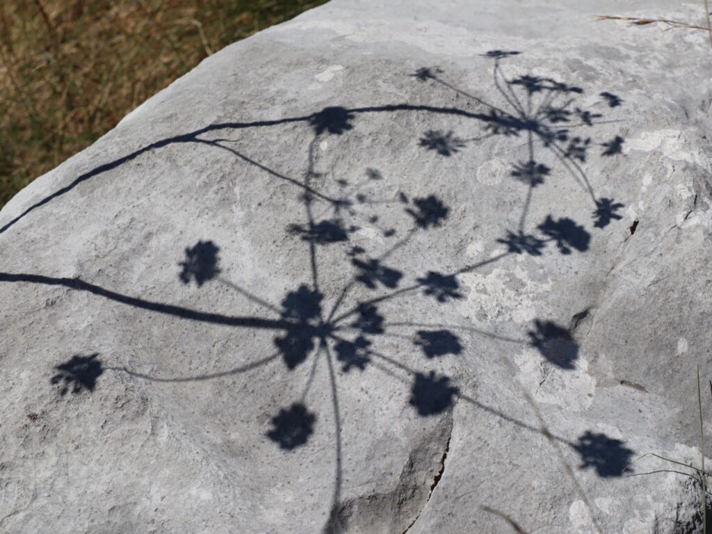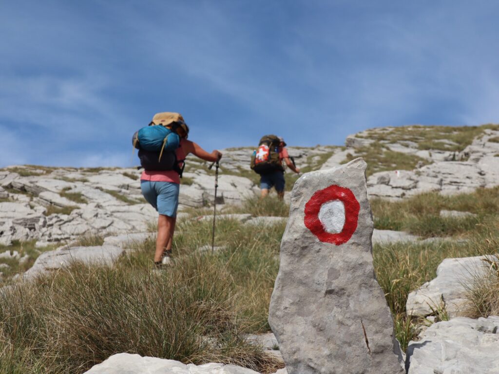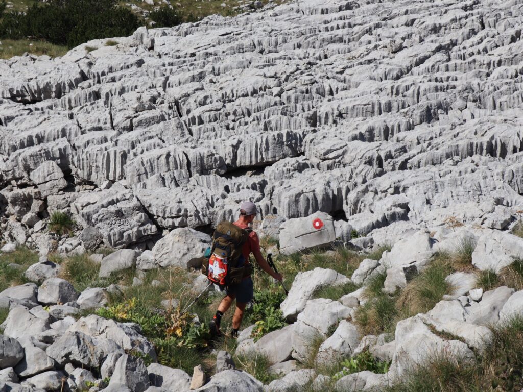 Fürs Auge ein wunderschöner Abschnitt, wir wandern den riesigen Karstfeldern entlang und teilweise auch darüber. Immer noch im Minengebiet, versuchen wir die Wegspur zu halten. Dort wo Kuhfladen die Wiese kleistern, trauen wir auch weglos eine Abkürzung zu nehmen.