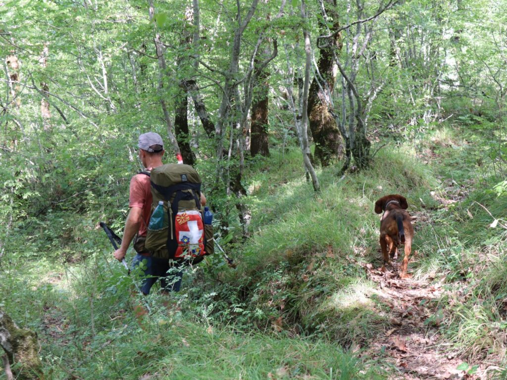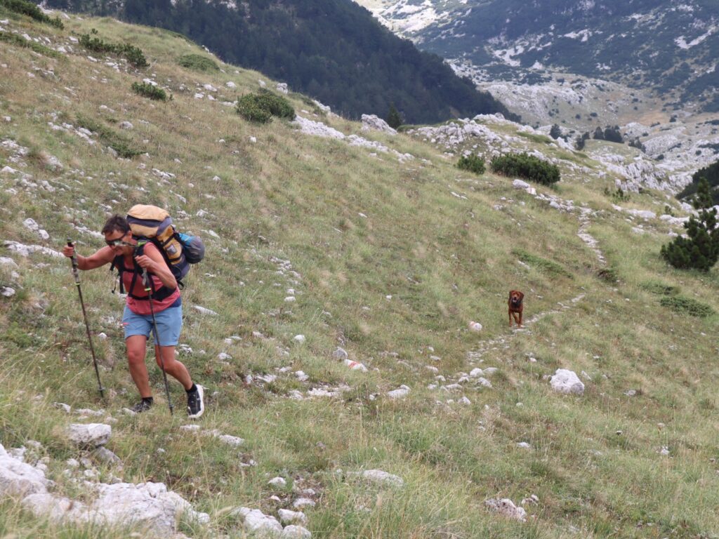 Zwei der drei Hunde verziehen sich bald, doch ausgerechnet das Hinkebein bleibt hartnäckig. Er versteckt sich zwar immer wieder im Wald oder hinter Felsen, doch erfreut über seine weglosen Abstecher sind wir nicht, denn die Prenj-Mountain sind noch nicht komplett von Minen geräumt.