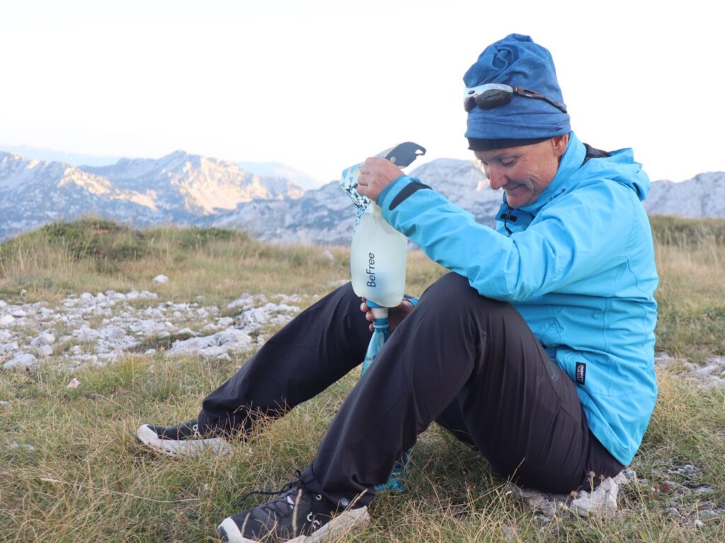 Bei der verschlossenen Hütte Adnan Krilić füllen wir unsere beiden 3-Liter Wasserbeutel aus dem Tank mit gesammeltem Dachwasser, denn wir wissen nicht, ob wir heute nochmals Wasser haben werden.