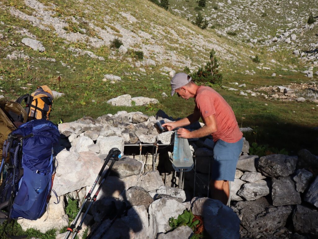 Die Quelle bei der Jezerce Hütte hat noch Wasser, im Gegensatz zur Quelle gestern bei Bijele Vode. So schöpfen wir nochmals nach, denn viele Möglichkeiten wird es auch heute in diesem karstigen Gelände nicht geben.
