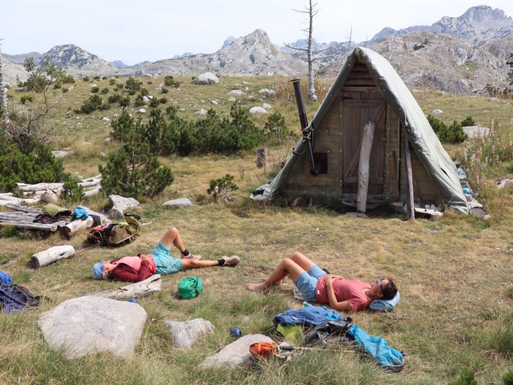 Beim Biwak Lučine erinnern wir uns an einen Tisch und Bänke für unseren Mittagshalt, ausser ein paar Holzbrettern und Pfählen am Boden ist davon jedoch nichts mehr zu sehen. Dafür bietet sich die Wiese für ein Nickerchen an.
