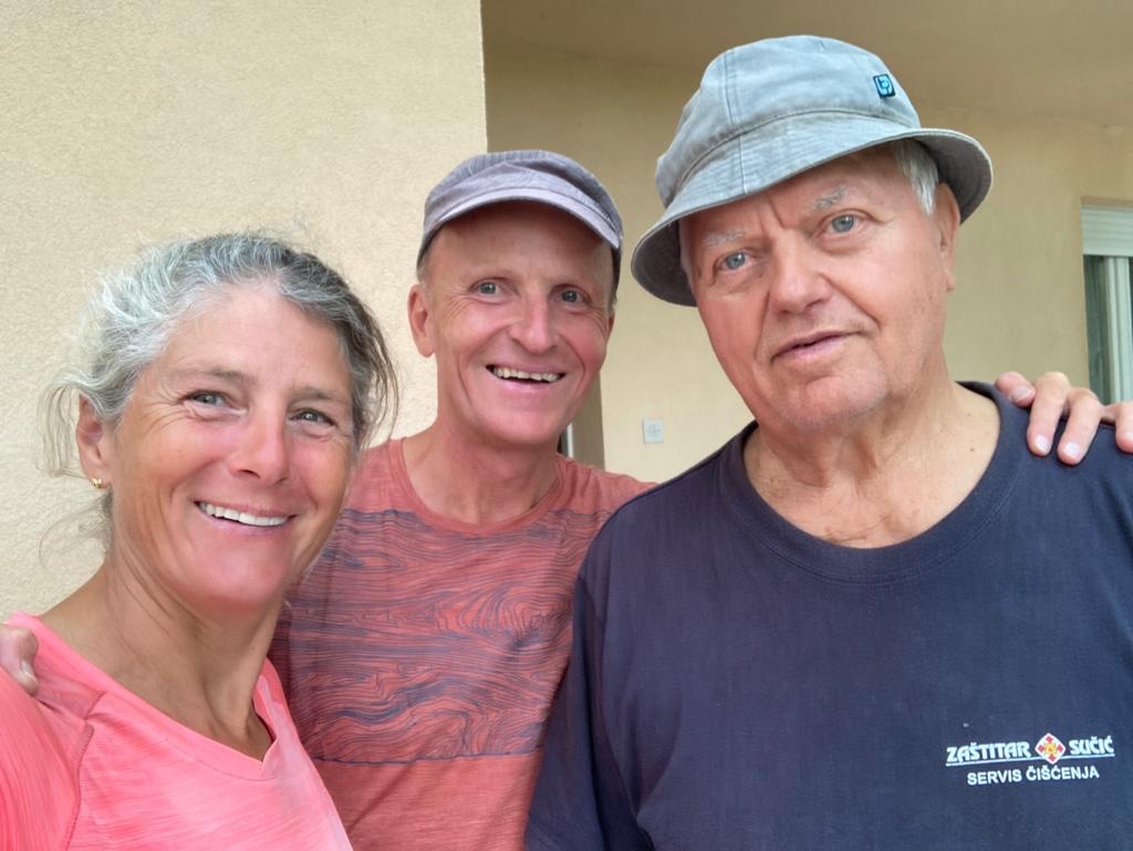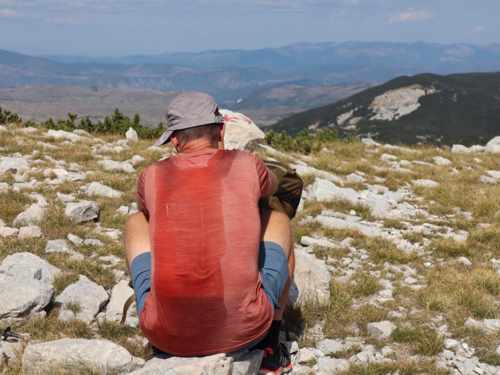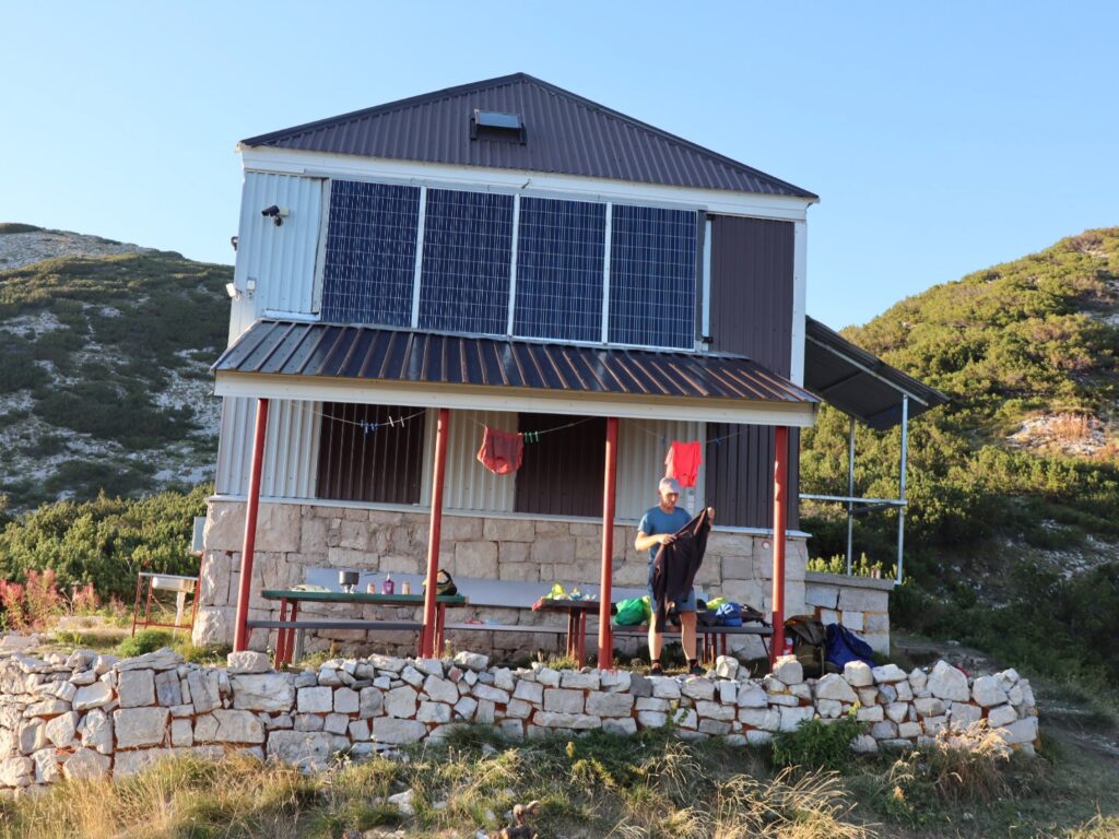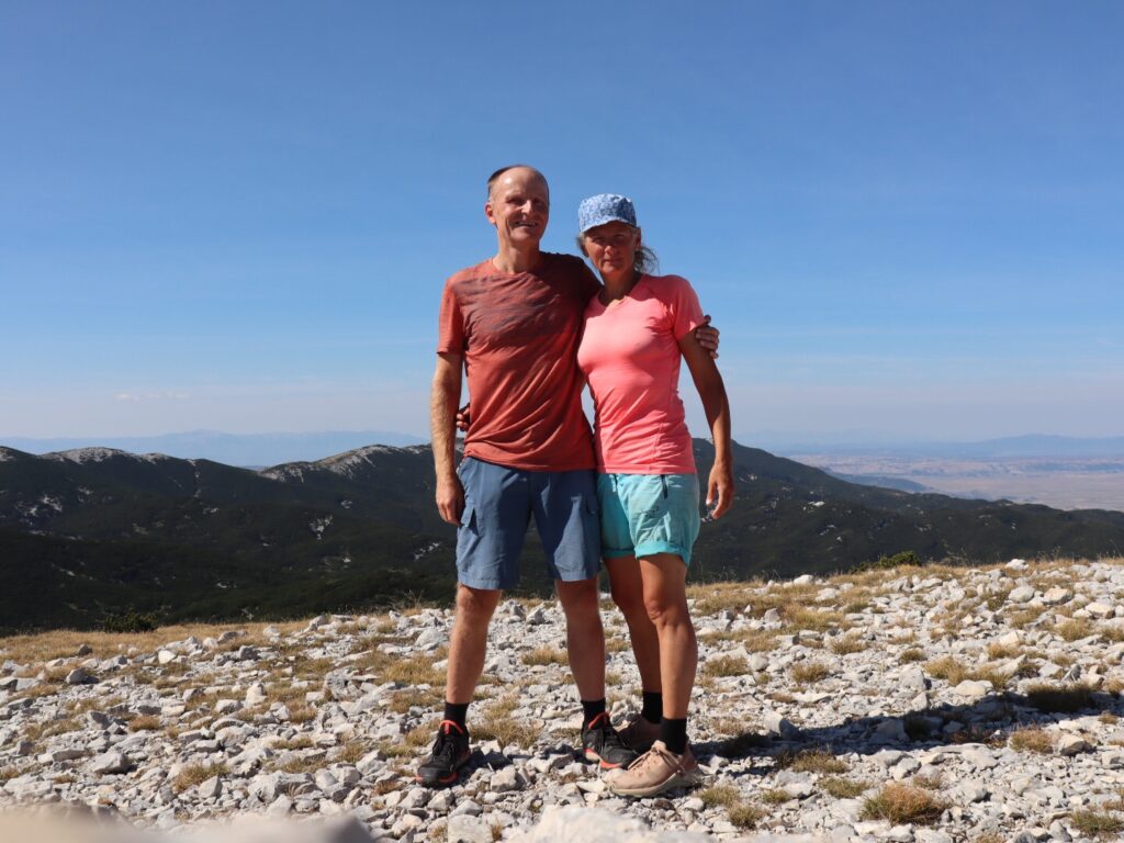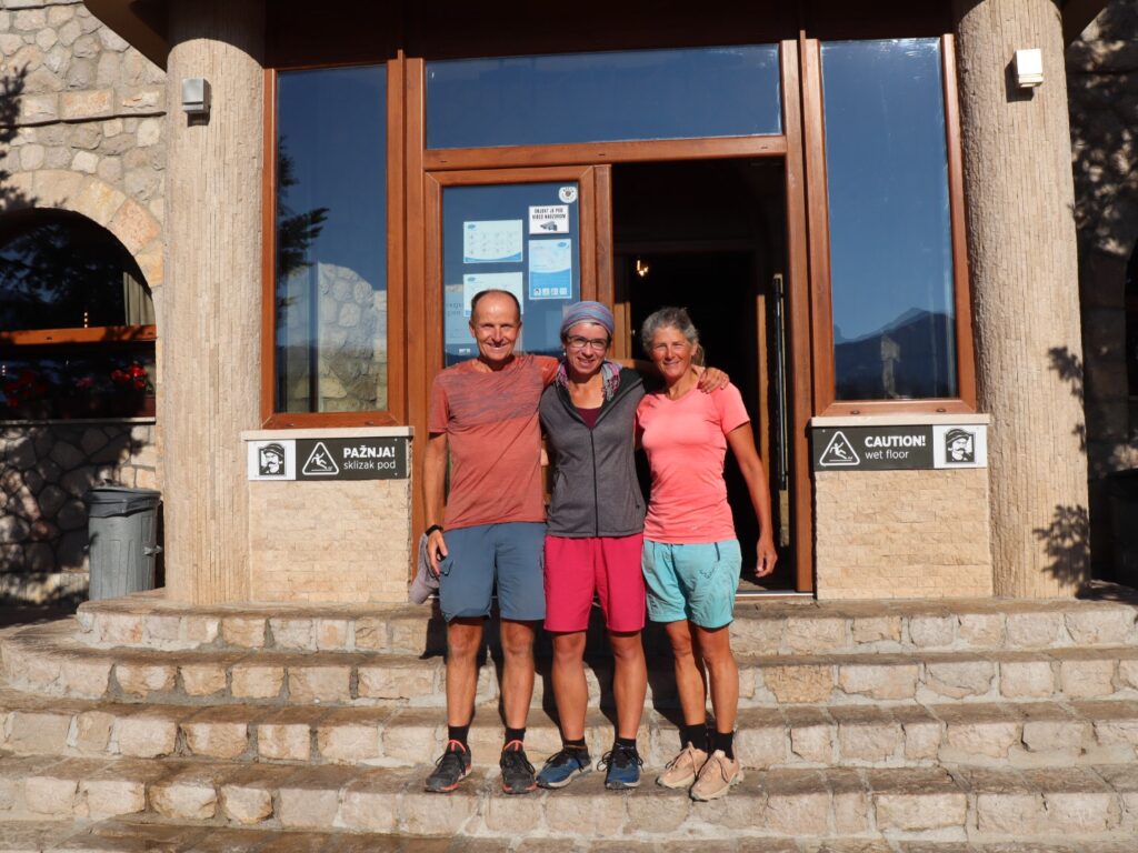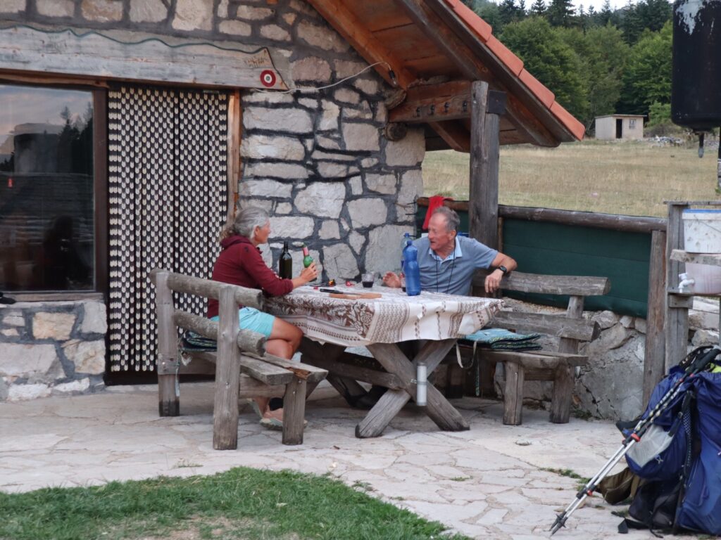 Im steten Auf und Ab bei nochmals sehr heissen Temperaturen kommen wir zünftig ins Schwitzen und unser Wasserverbrauch ist recht hoch. Bei der Alp Omrčenica nach einem ersten Abstieg verbringt noch ein Landwirt den Sommer mit seinen Tieren, da möchten wir nach Wasser fragen. Aber niemand ist zu sehen. Dafür treffen wir auf Stipe, bereits im letzten Jahr sind wir von seiner Lebenspartnerin Vesna herzlich bewirtet worden. Gut haben wir einen Pausentag eingelegt, denn bis gestern waren sie in Kroatien im Urlaub.