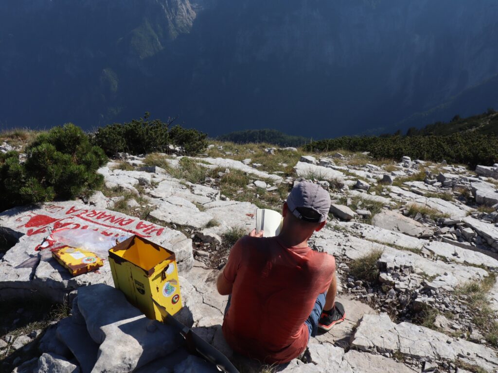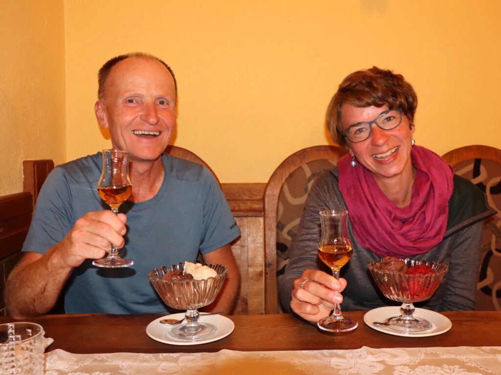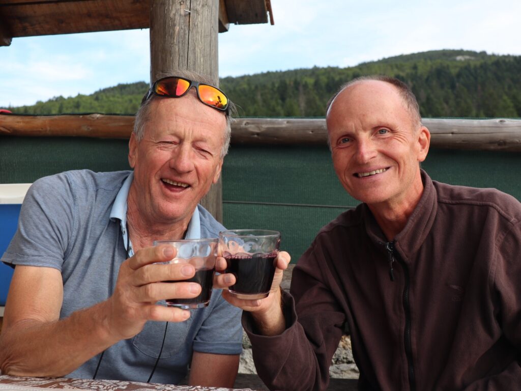 Beim Dom Plasa haben wir schon einen grossen Teil des Aufstieges geschafft und gönnen uns süsse Snacks. Gerade als wir aufbrechen wollen, steigen drei Jungs zur Hütte ab. Sie sind Mitglieder des Bergclubs und haben somit den Schlüssel zur Hütte. Es dauert nicht lange, da steht ein Rakija vor uns.