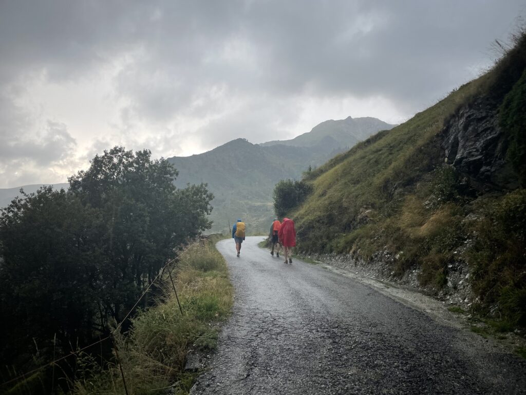 Aber beim Start ist es trocken und wir vertrauen auf die Worte des Wirtes, dass es besser wird. Die Frage steckt uns im Hals: wann so? Auf alle Fälle noch nicht jetzt. Wir lassen die erste Kurve des Fahrsträsschens hinter uns und schon wieder geht es mit schauerartigem Niederschlag los. Nicht alles Gute kommt von oben…Jeder stürzt sich in die Regenmontur und so ziehen wir als bunte Papageien mit gestutzten Flügeln weiter den Hang hoch.