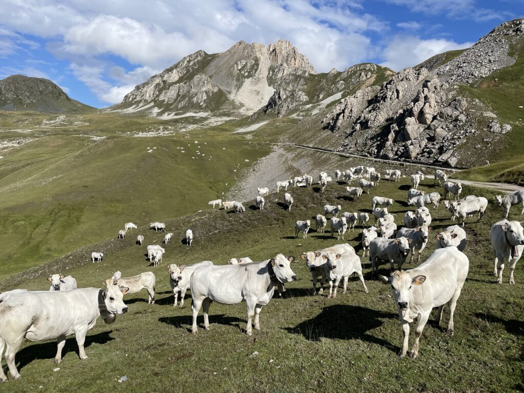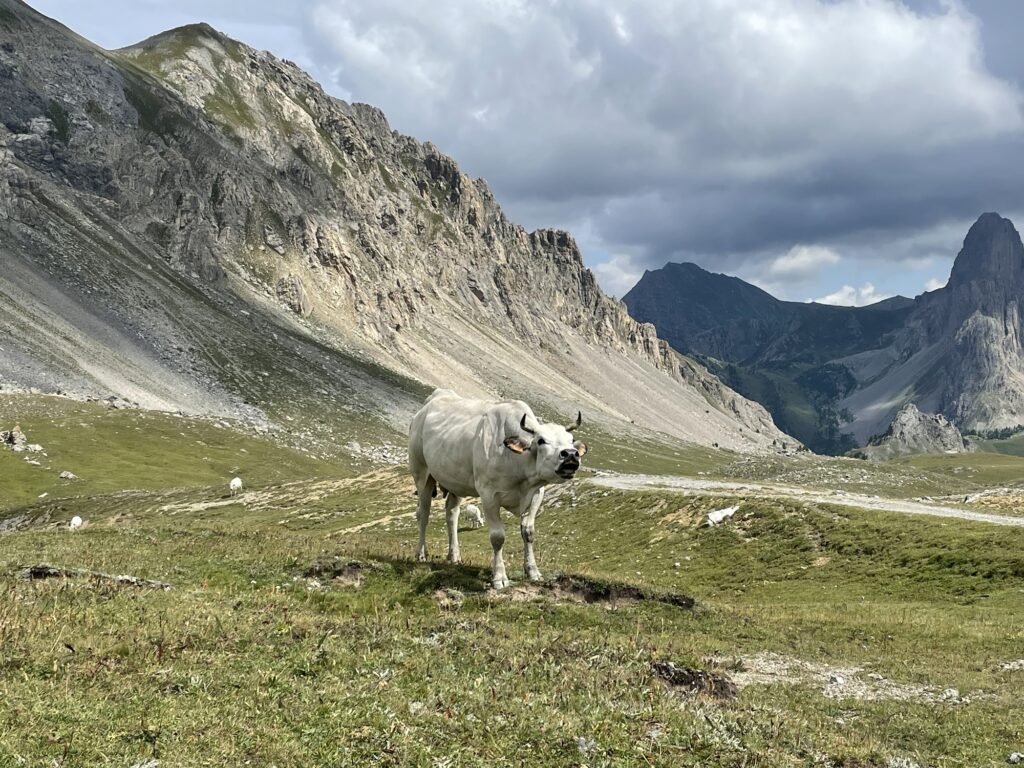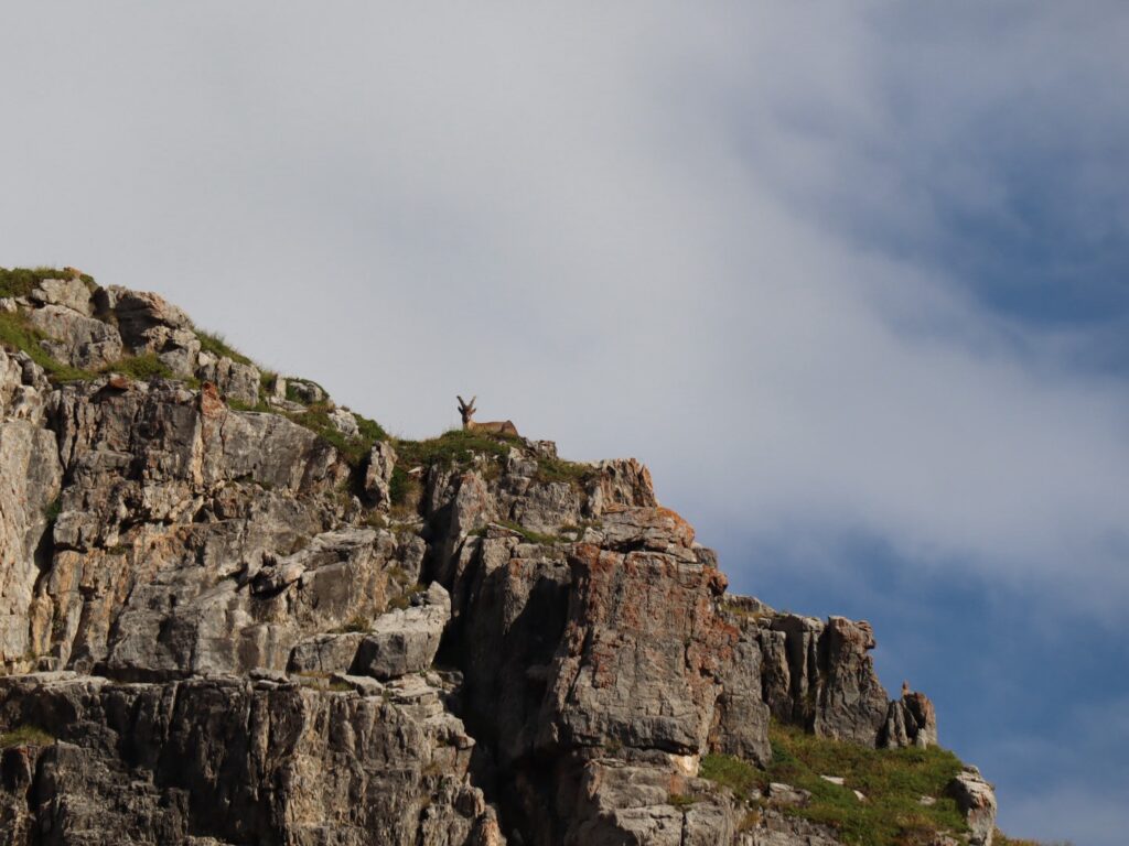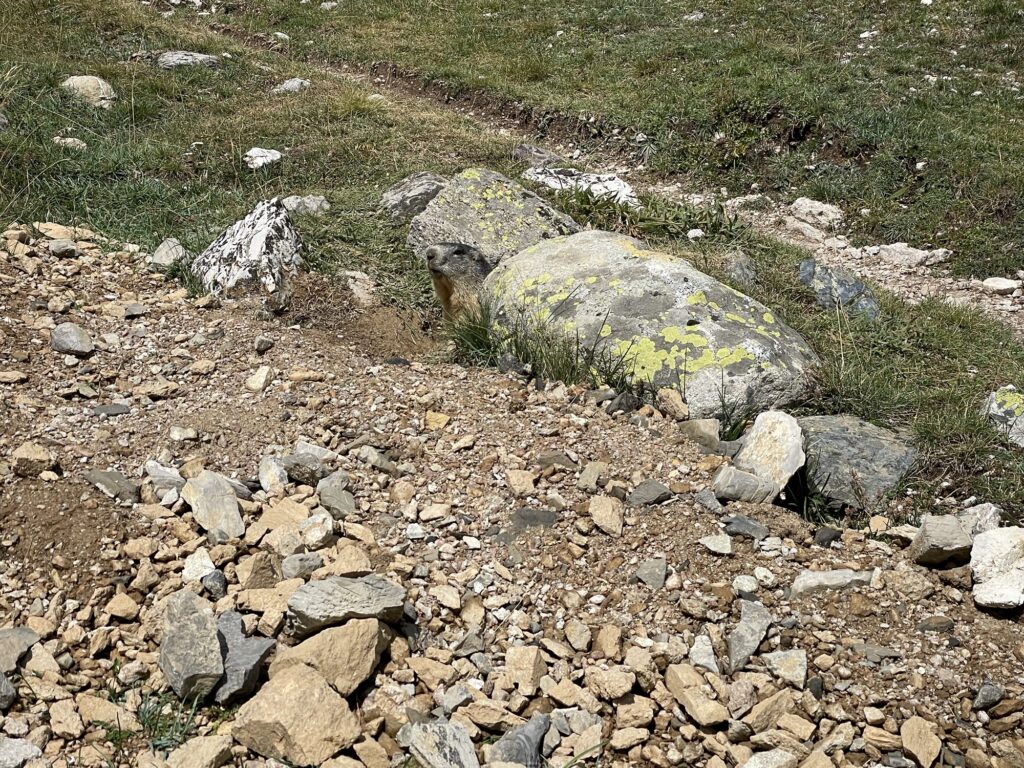 Noch eine Talsenke gilt es zu überqueren, es wimmelt von zutraulichen Murmelis mit ihren Jungen, wandernden und bikenden Freizeitsportlern, muhenden Kühen und auch Steinwild zeigt sich aus sicherer Distanz.