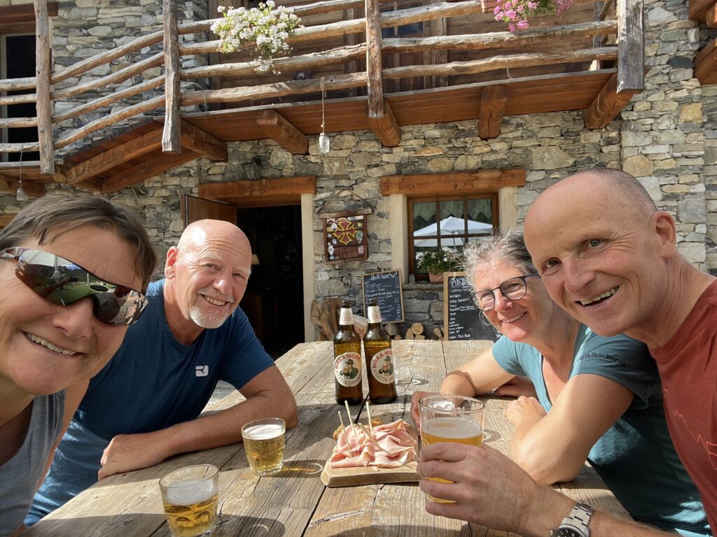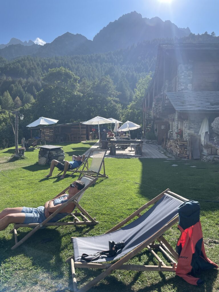 Kurz vor unserem Tagesziel, dem Rifugio Viviere, erkennen wir bereits gelaufene Wege wieder. Denn im Wanderblock 2023 kamen wir auf unserer letzten Etappe bereits hier vorbei und haben uns ein Abschlussplättli gegönnt. Ein magischer Platz leicht oberhalb von Chialvetta. Umso schöner, können wir in diesem Jahr hier übernachten und so den Kreis zur GTA 2023 schliessen. Es fühlt sich fast an, wie nach Hause zu kommen.