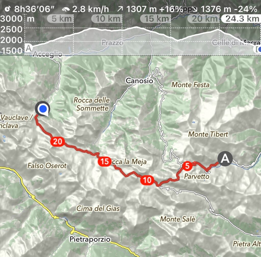 Das hat auch einen Grund, das Hotel della Pace in Sambuco ist für heute Abend bereits seit Mai ausgebucht, so musste eine Alternative her. Komoot sei Dank, er spuckt eine machbare Etappe ab San Magno ins Rifugio Viviere aus. Plan B steht!