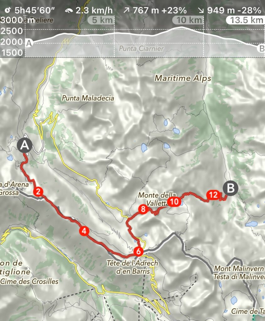Zudem beschützt uns der breite Grat vor Blicken auf beide Seiten, rechts zeigen sich die hässlichen Narben des Skigebietes Isola 2000, glücklicherweise wurde ein Ausbau auf die italienische Seite nicht erlaubt, und links führt die Passstraße auf den Col de la Lombarde zur französischen Grenze.