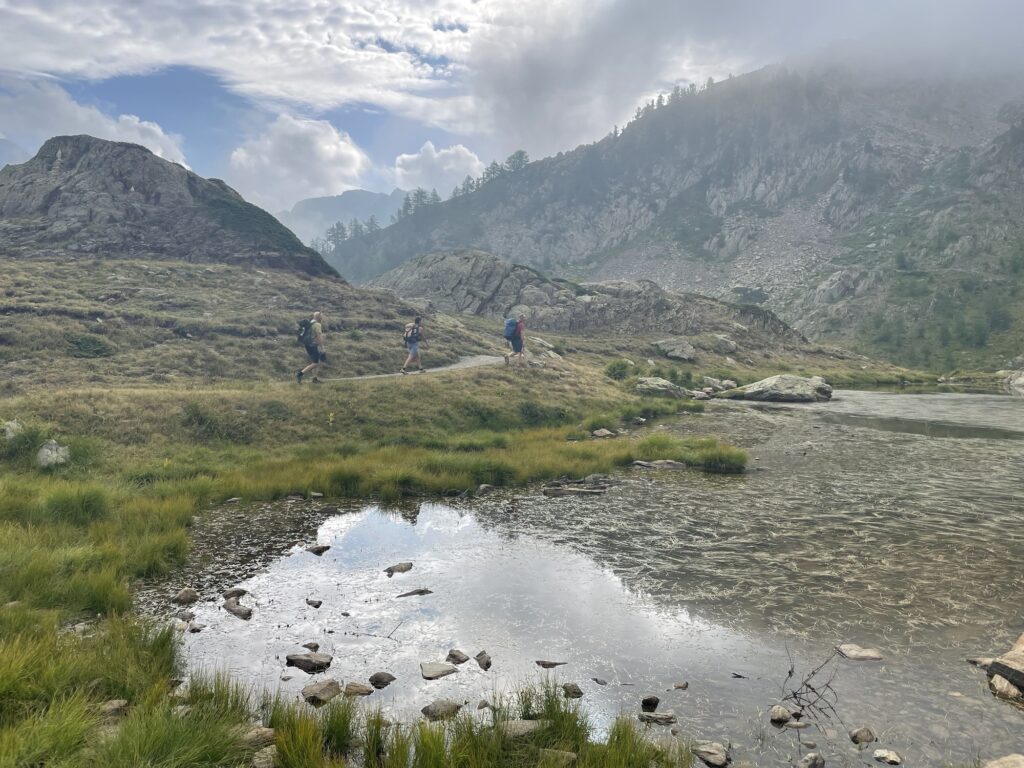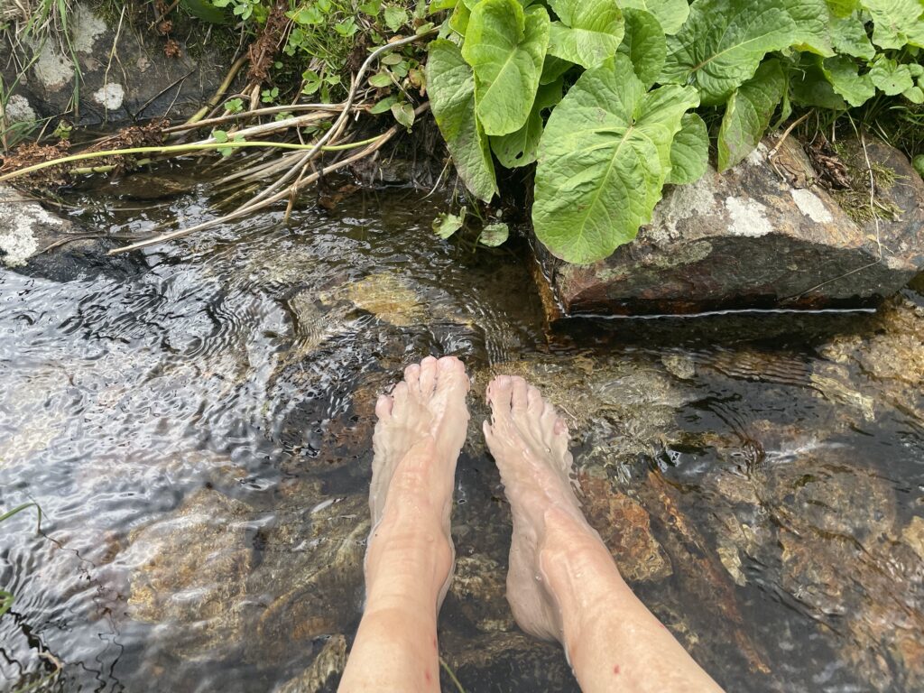 Es fehlen noch einige Höhenmeter hinunter zum Rifugio Malinvern. Doch dem wunderschön plätschernden Bergbach können nicht alle widerstehen. Kneippeinlage und Katzenwäsche ersetzt die Dusche im Rifugio.