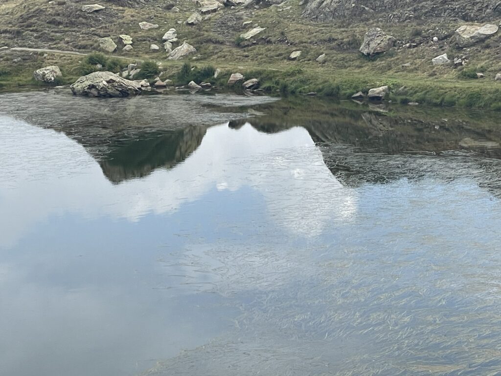 Der schimmernde See am Weg erinnert uns an den noch offenen Wunsch nach Forelle vom Grill. Immerhin, den Coniglio können wir als gegessen verbuchen. War das Nachtessen im Sant‘ Anna wirklich so priesterlich, dass wir Menuträume durchleben? Ja, das war es.