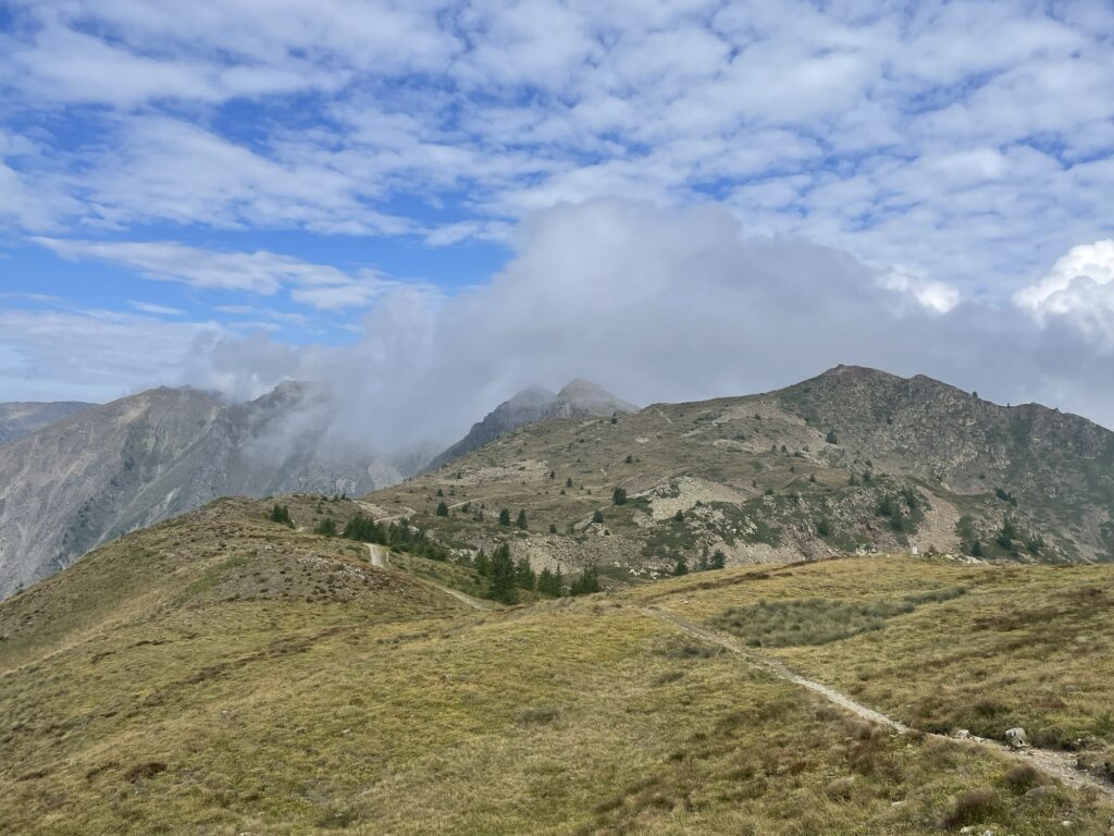 Bald sind wir auf dem breiten Grenzkamm zwischen Frankreich und Italien, entsprechend ändert sich die Begrüssungsfloskel am Weg von Buongiorno, Salve oder Ciao auf Bonjour oder salut. Der rostige Stacheldraht mahnt an frühere Zeiten und wirkt auch heute bedrohlich.