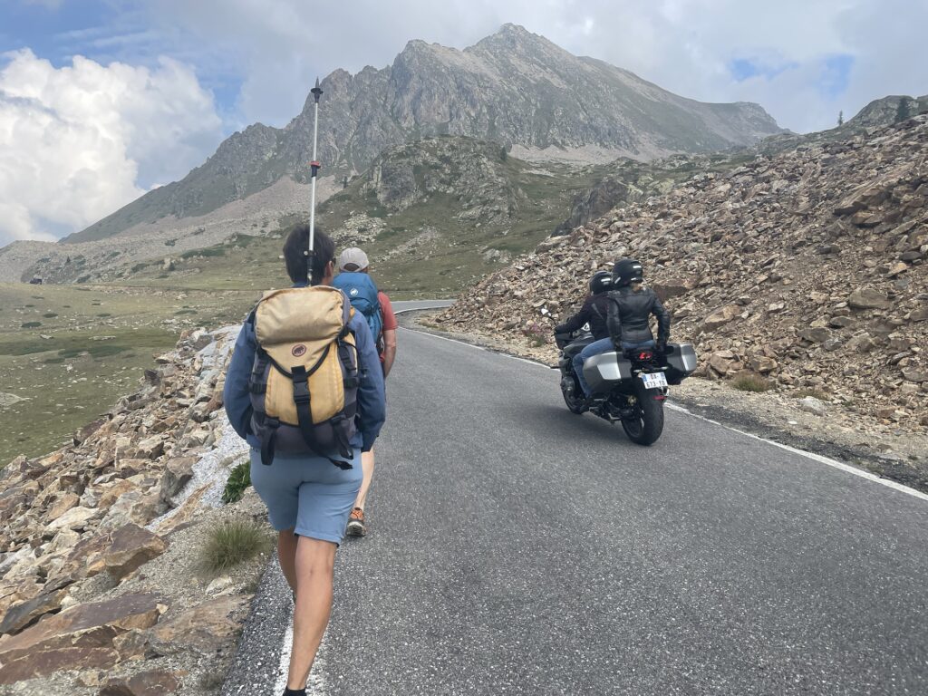 Kurz nach dem stark frequentierten Pass nehmen wir den Hinterausgang und entwischen wieder in die Einsamkeit. Doch vorher müssen wir noch den heikelsten Teil unserer Wanderung bewältigen, die Strassenquerung fordert uns aufs Höchste heraus. Töffmikado, wer den Töff berührt, ist aus dem Spiel.