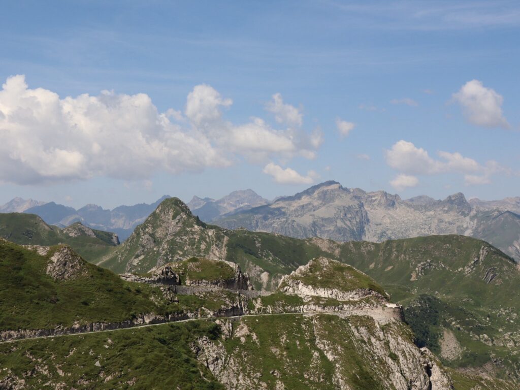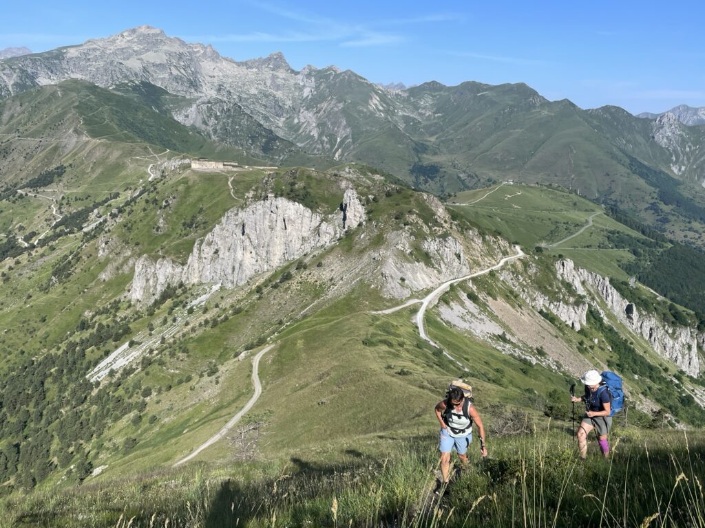 Zum Glück bleiben uns nur wenige Meter auf den befahrenen Militärstrassen, schon sehr bald können wir über die Grenzkämme ziehen und auf die beidseitig ausgeprägten gezickzackten Strassenfurchen im Berg schauen.