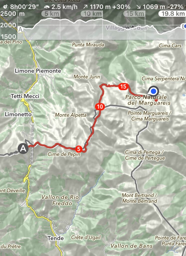 Heute schenken wir uns etwas, und zwar etwa 700 HM! Valter vom Patatouc fährt uns am Morgen zum Tende-Pass hoch, die körperlich angeschlagene Hälfte schätzt diesen Lift bereits am Morgen, die übermütige Hälfte dann am Abend umso mehr.