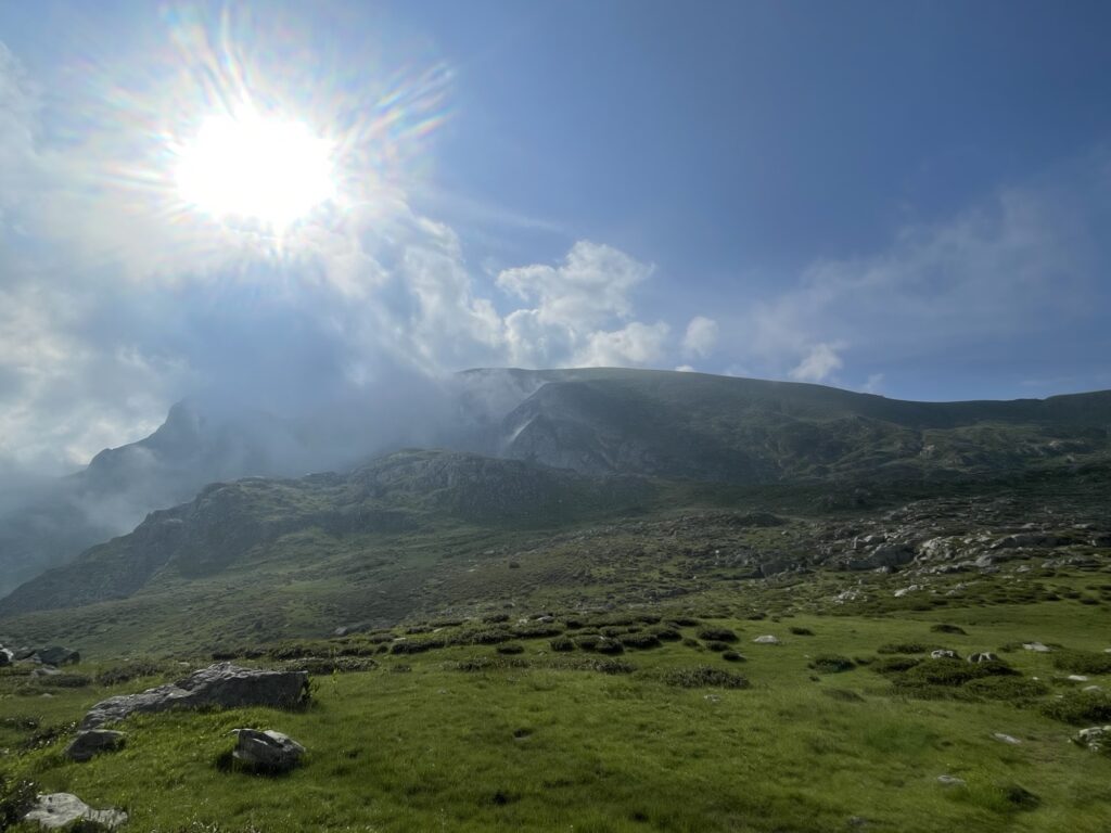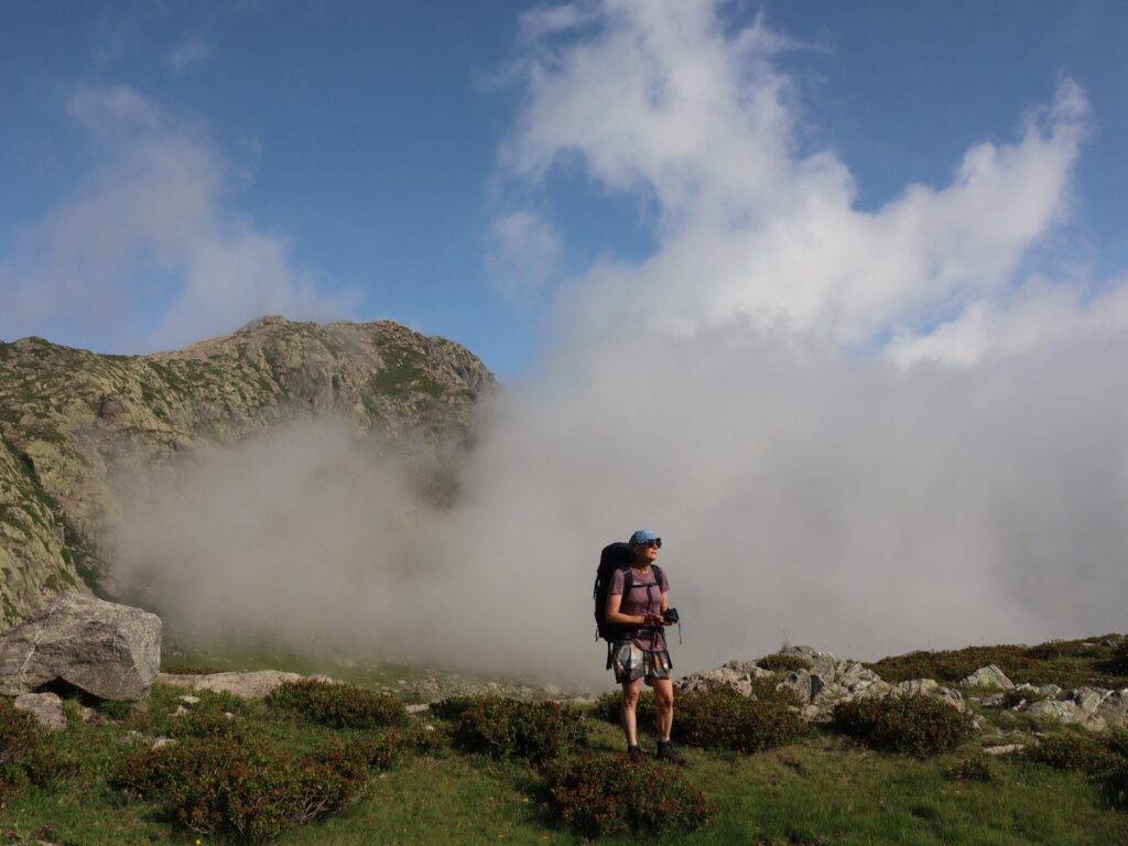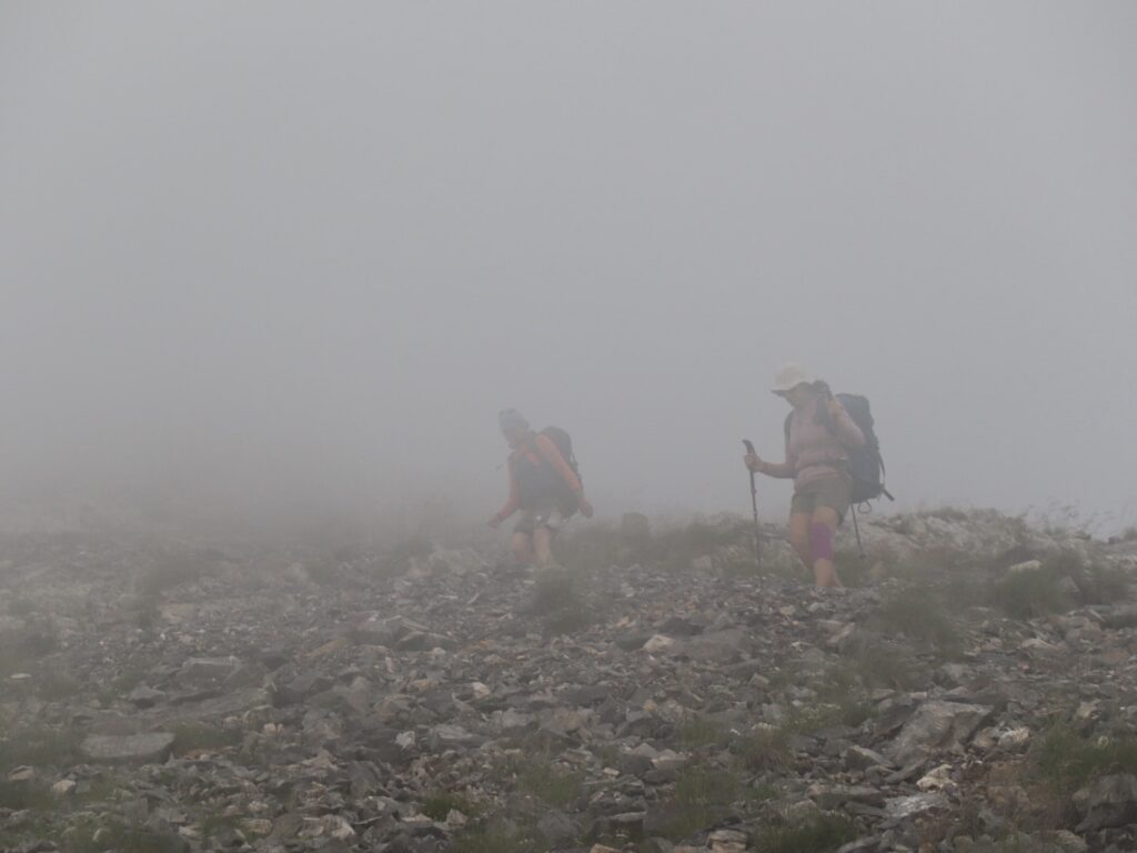 Nebelschwärme manteln uns im Aufstieg immer wieder ein, der Blick auf die umliegenden Berge wird auf und zugezogen wie mit einem Vorhang.