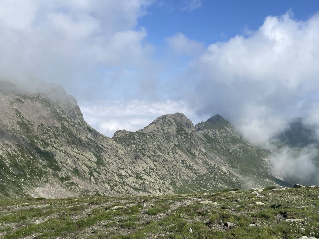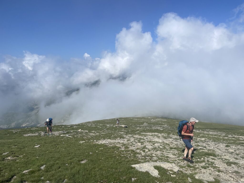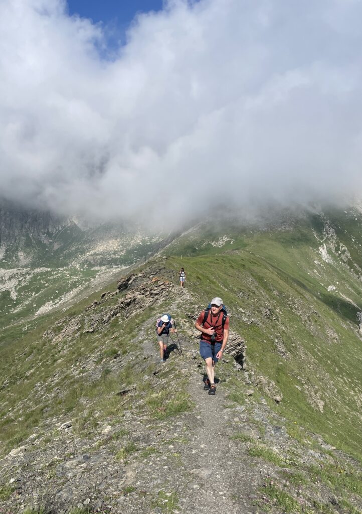 Die Murmeli sind auch wach und pfeifen uns im Aufstieg zu Höchstleistung an. Bald sind wir über den ersten Pass und müssen uns entscheiden, ob wir die Gipfelvariante wagen wollen oder unten durch gehen. Es ziehen zwar viele Nebelschwaden umher, aber die Wolken sehen nicht nach baldigem Wetterumbruch aus. So ist klar, wir wagen den Weg über die Berge.