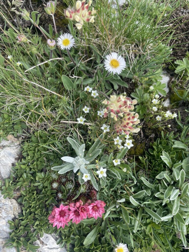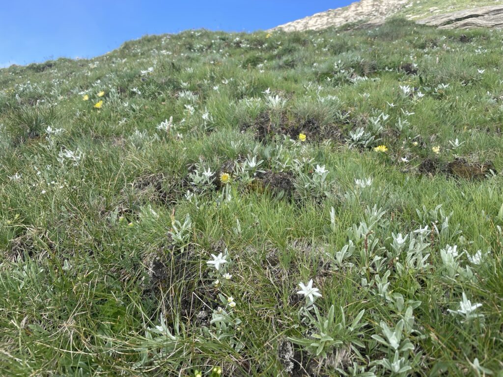 Im Zwischenabstieg können wir unseren Augen kaum trauen: alles ist mit Edelweiss übersät. Wir wandern sozusagen auf einem Edelweissteppich, wer schätzt da noch einen roten Teppich! Das muss ein Augenspektakel sein in 2 – 3 Wochen.