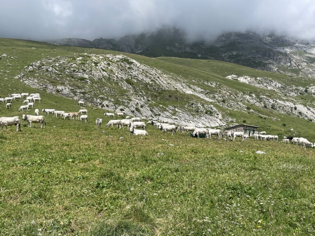 Friedlich weidet das Vitello noch ganz ohne tonnato, die Herdenhunde stechen bellend auf uns zu, erkennen aber bald dass wir vielleicht als Endverbraucher ihrer Produkte noch wertvoll sein könnten.
