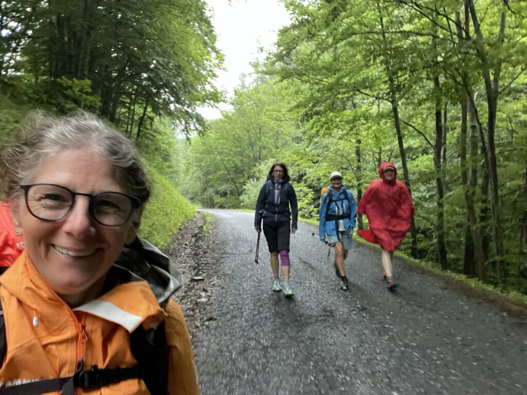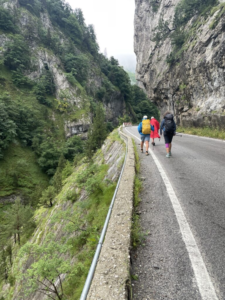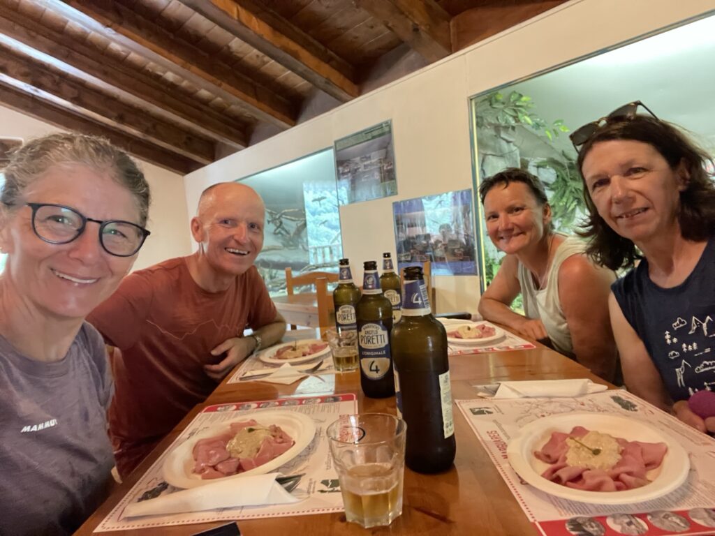 Es folgt ein schöner Schluchtenweg und  pünktlich zum italienischen pranzo sitzen wir in der Foresteria Carnino auf der Sonnenterrasse und bestellen unser traditionelles Vitello tonnato. Doch es dauert keine fünf Minuten, da setzt quasi aus dem Nichts Regen ein, tatsächlich haben wir eine zweite Punktlandung geschafft. So setzen wir uns in die gemütliche Gaststube und lassen ein erstes heftiges temporale mit knallendem Donner und Blitzen bei einem Schieber vorbeiziehen.